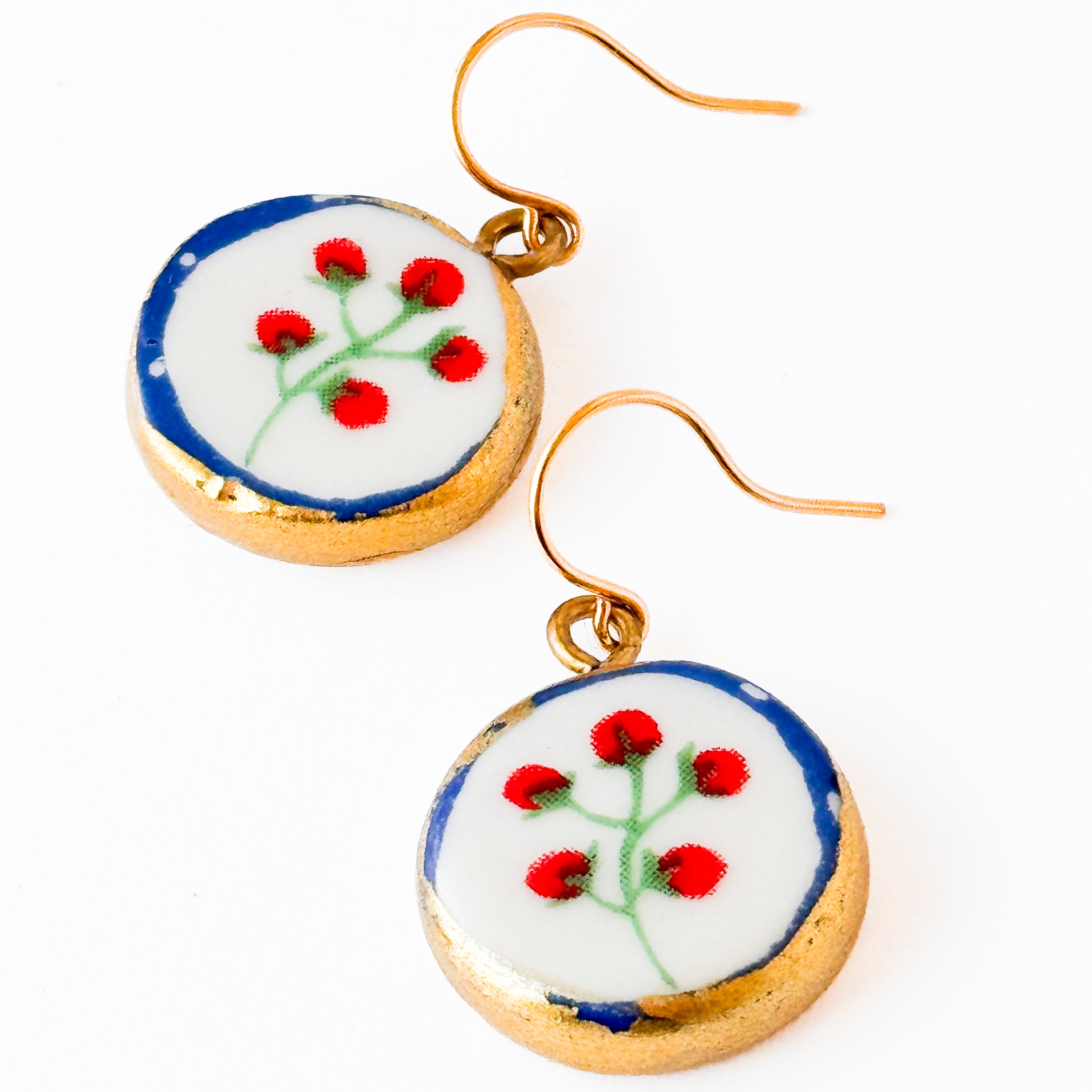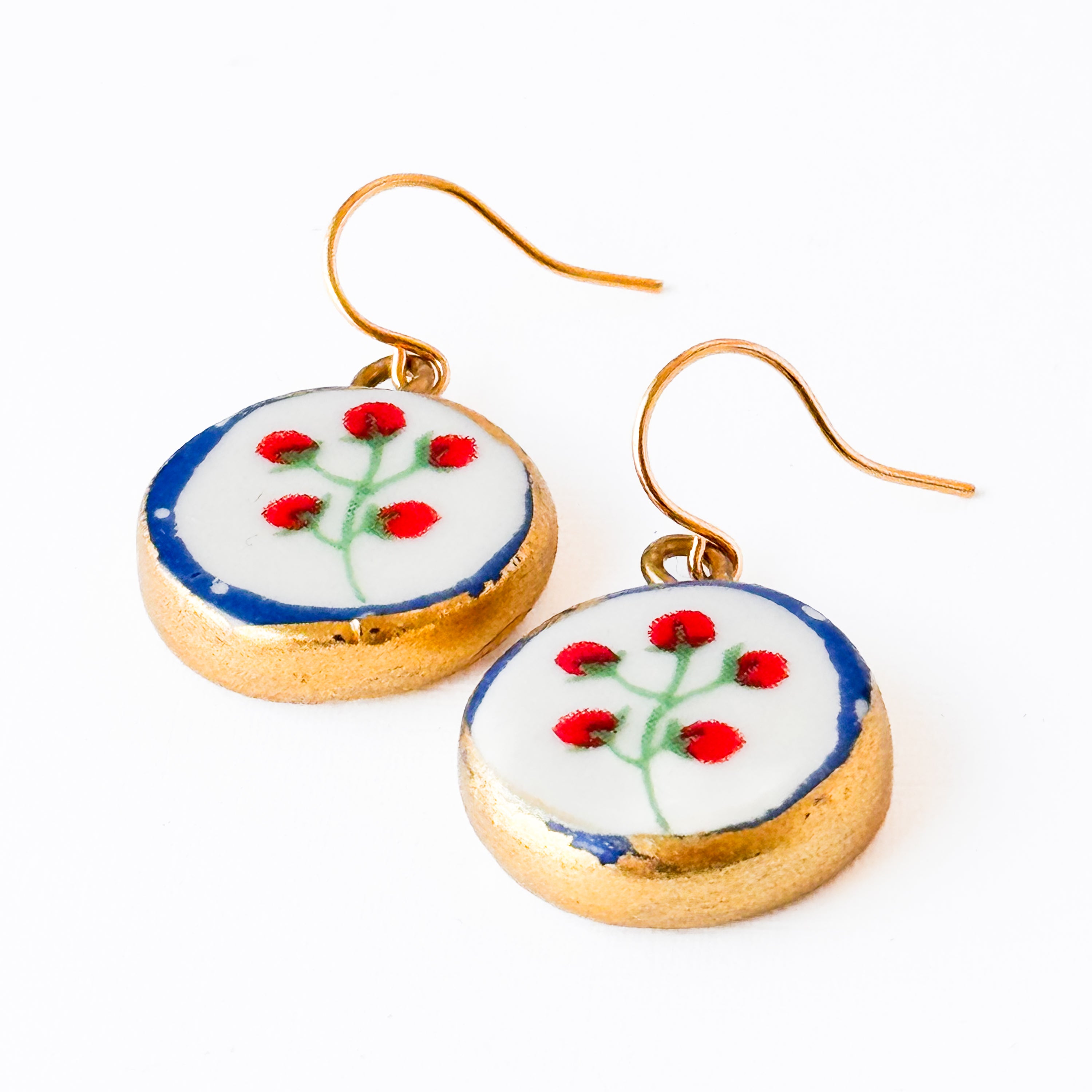 These lightweight ceramic earrings feature a round drop design with a delicate hand-painted floral motif. Finished with gold-plated ear wires, they offer an easy, comfortable fit and a soft pop...