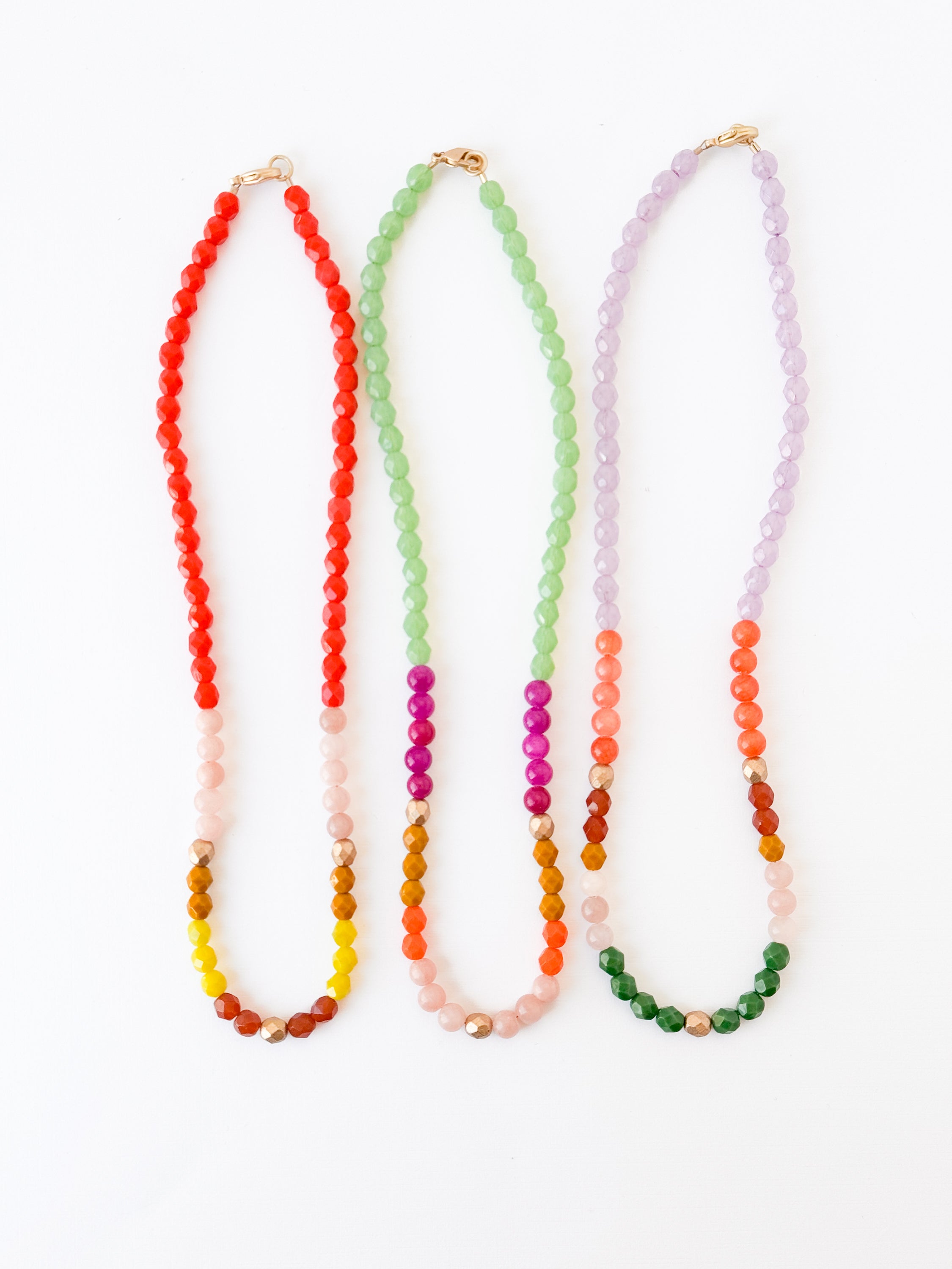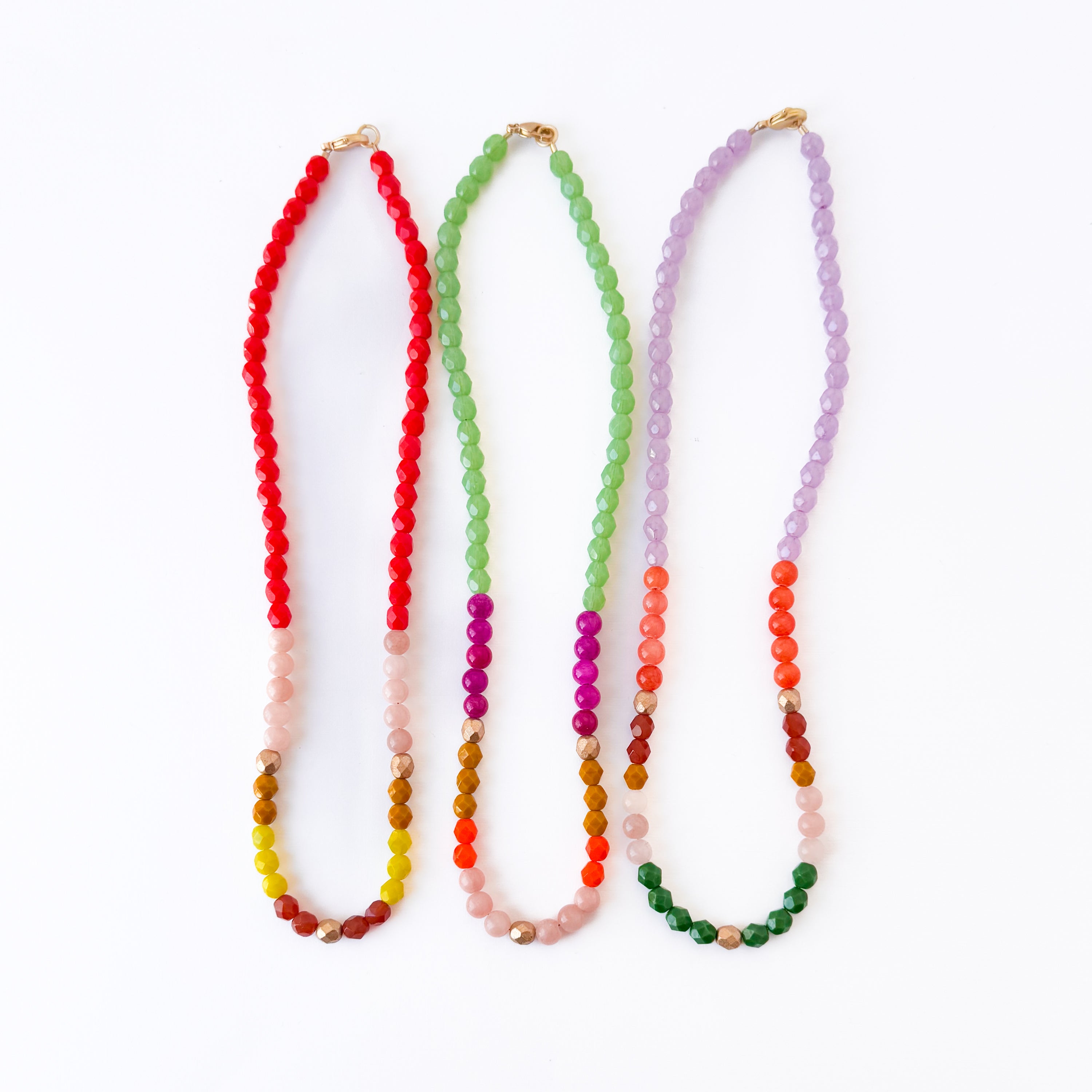Handmade Czech glass bead necklaces featuring vibrant color-blocked sections and faceted glass beads. Each necklace is finished with a satin 24K gold-plated clasp and designed to make an effortless statement,...