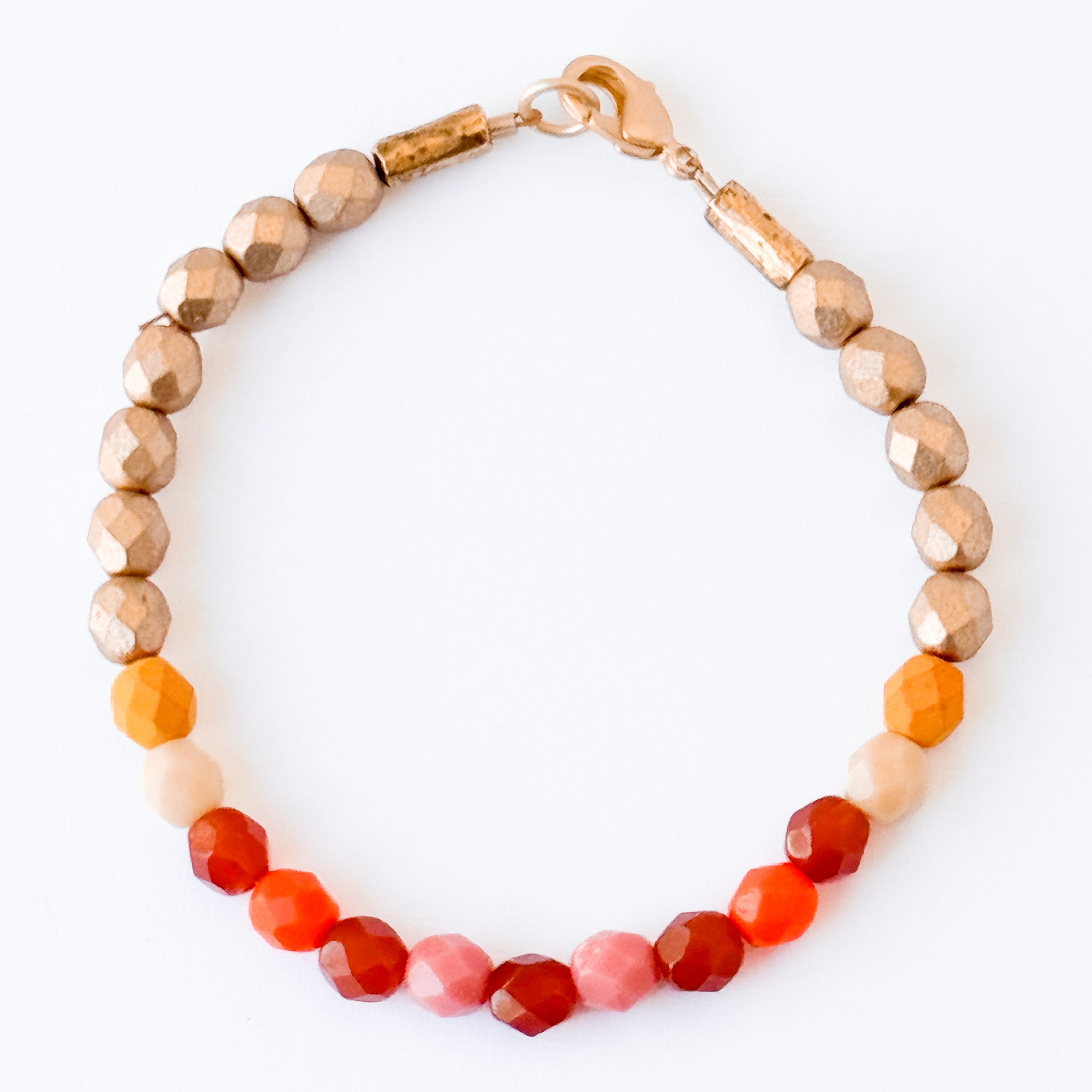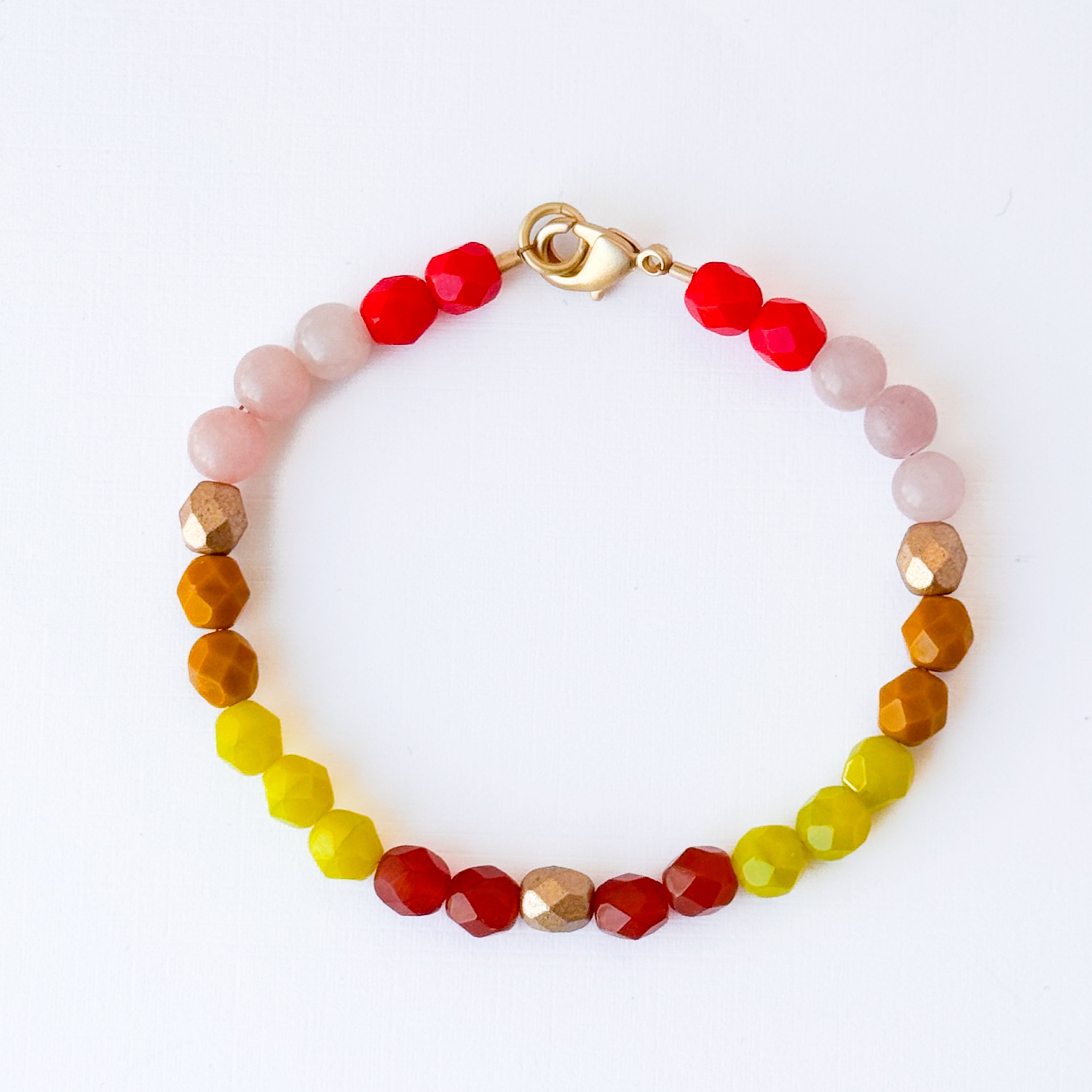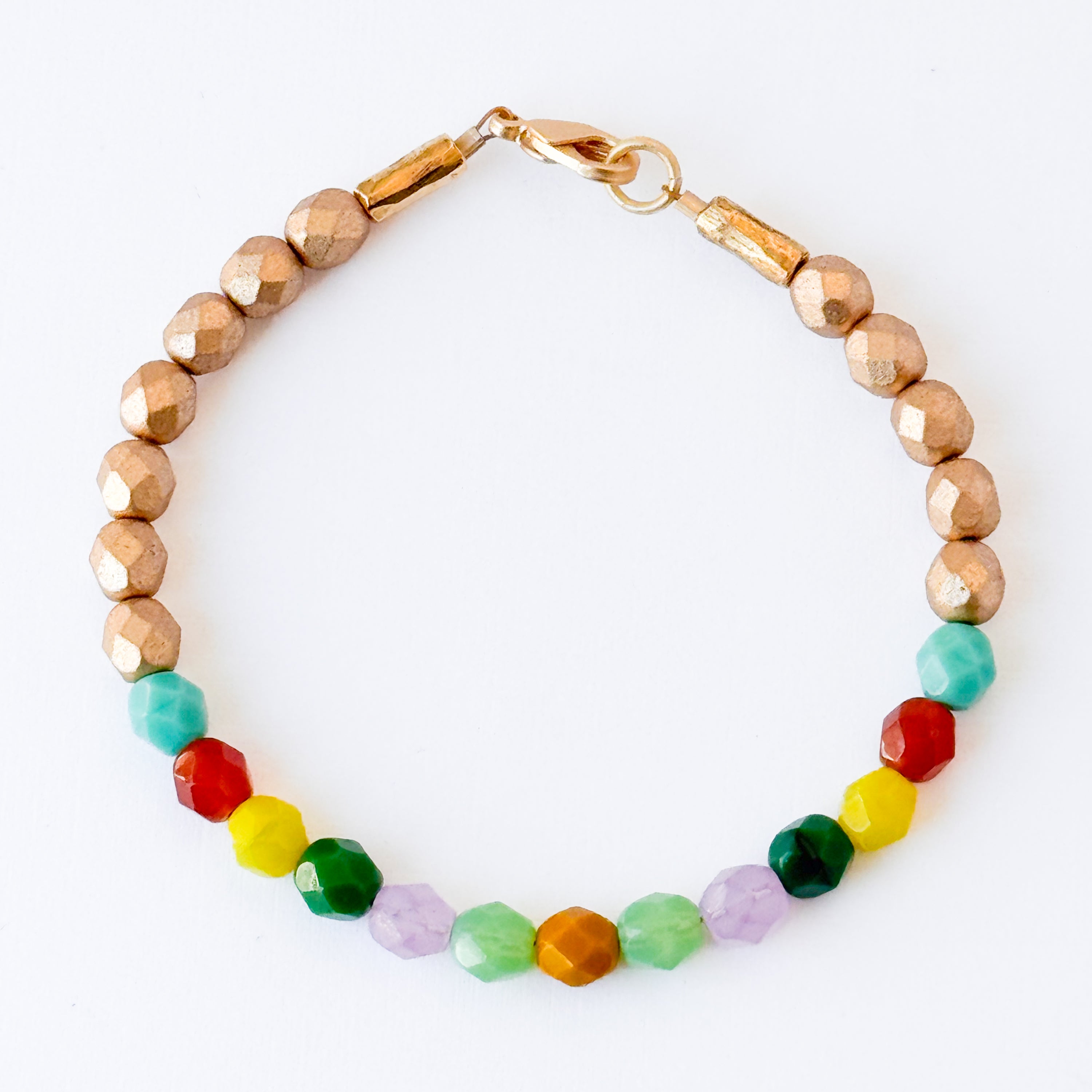 A vibrant faceted glass bead bracelet designed to add a playful pop of color with a refined finish. Featuring rich red or green color mixes paired with warm gold faceted...