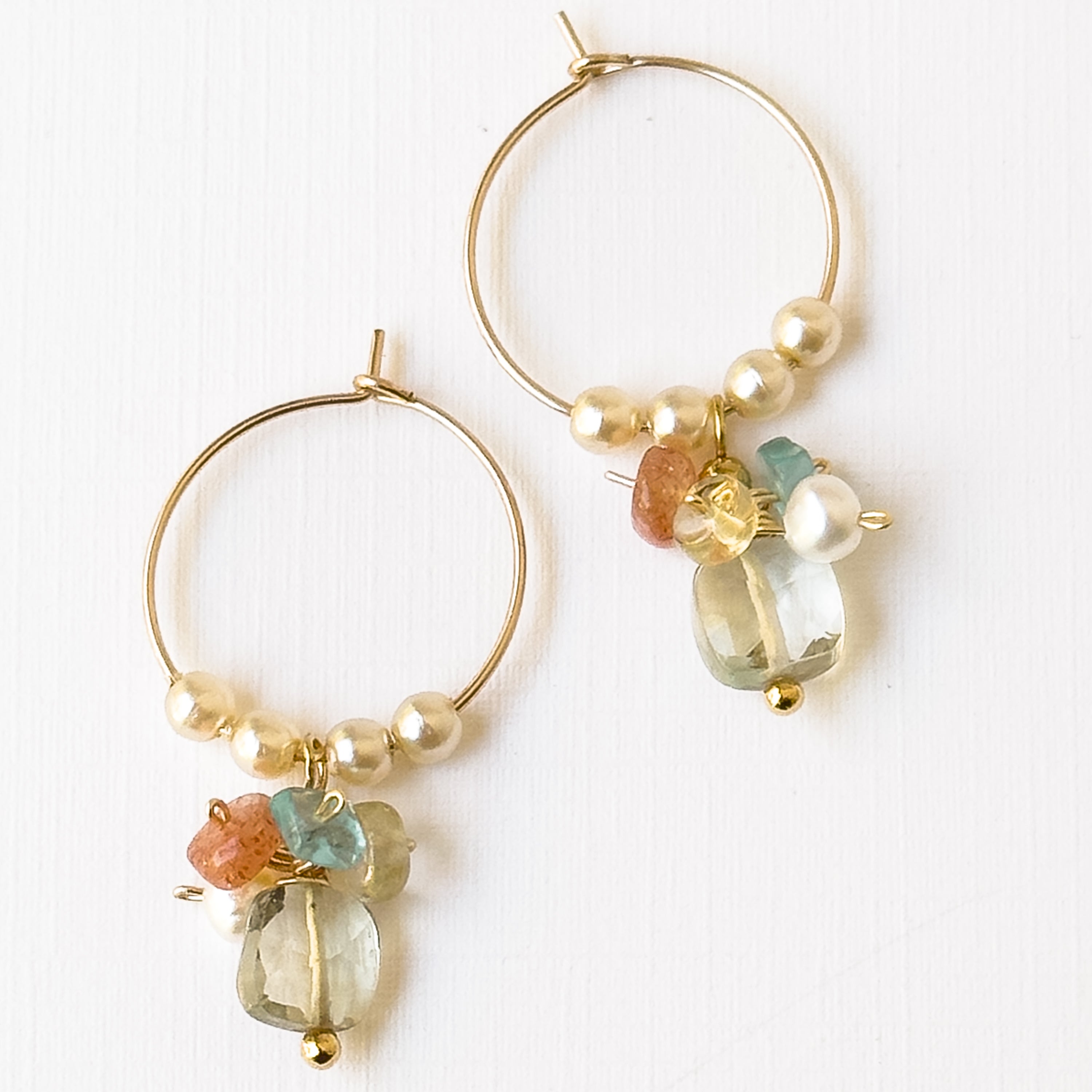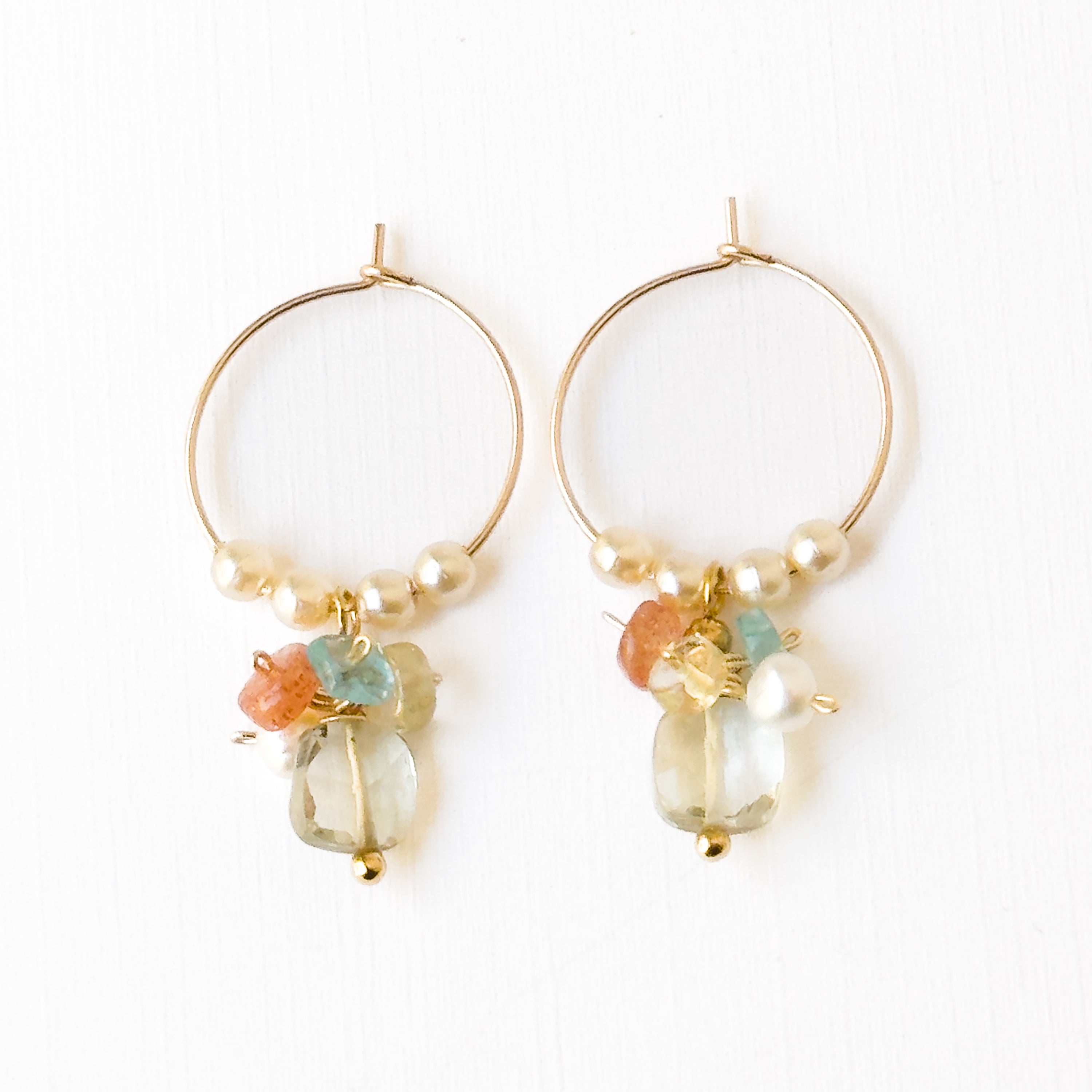Delicate .5" (16mm) gold filled hoops with tiny gold filled beads, crystal pearls, and a sparkling cluster over a pale green glass bead with a tiny aqua and coral bead and teeny pearl. Lightweight, handmade in Vermont, and ideal for everyday wear or holiday gift collections.