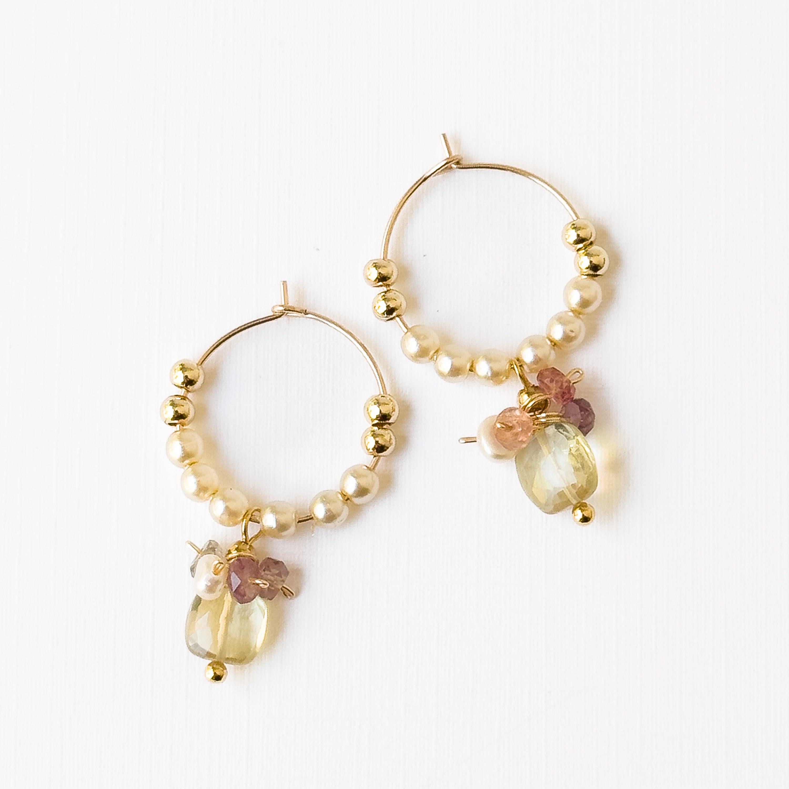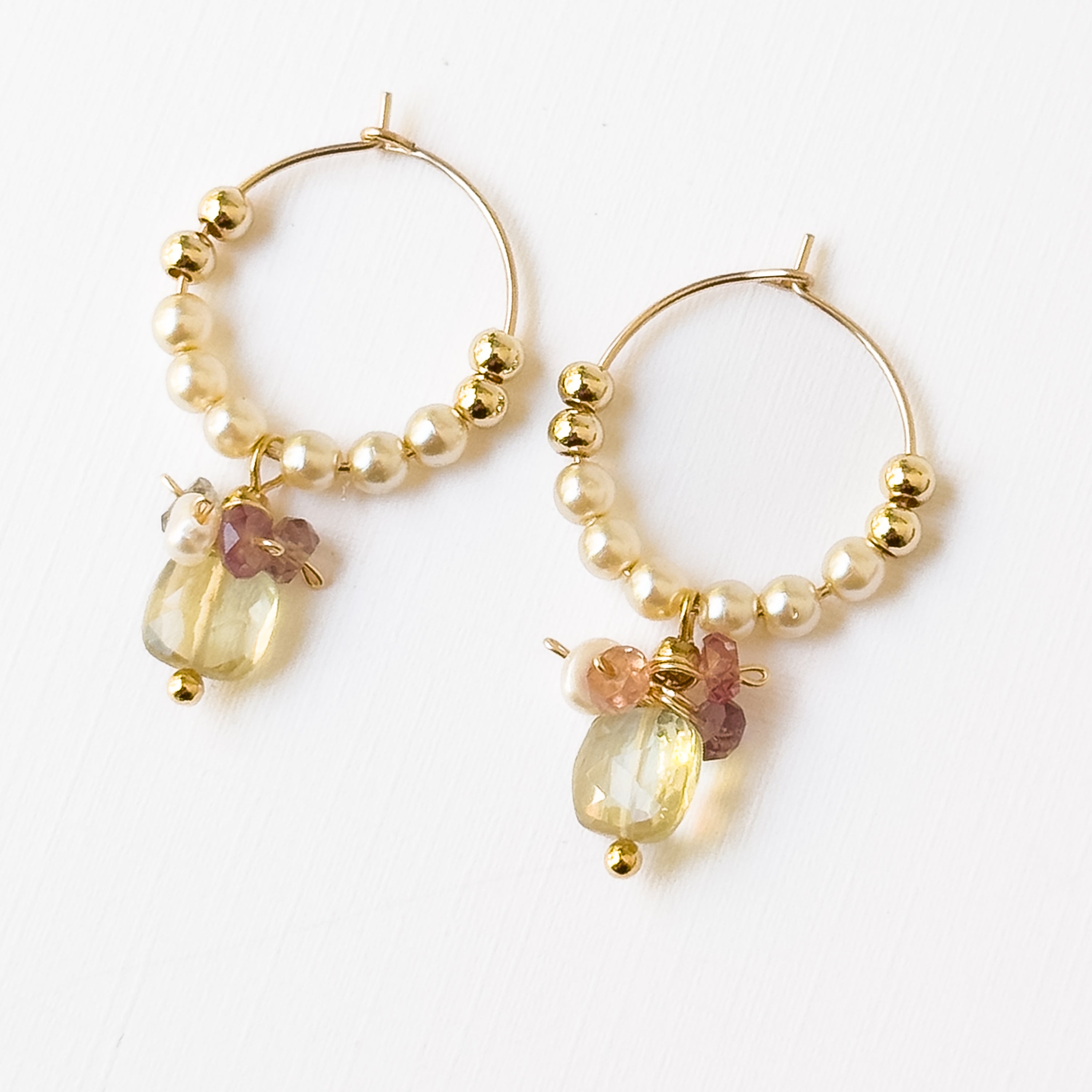 Delicate .5" (16mm) gold filled hoops with tiny gold filled beads, crystal pearls, and a sparkling cluster over a pale green glass bead. Lightweight, handmade in Vermont, and ideal for everyday wear or holiday gift collections.