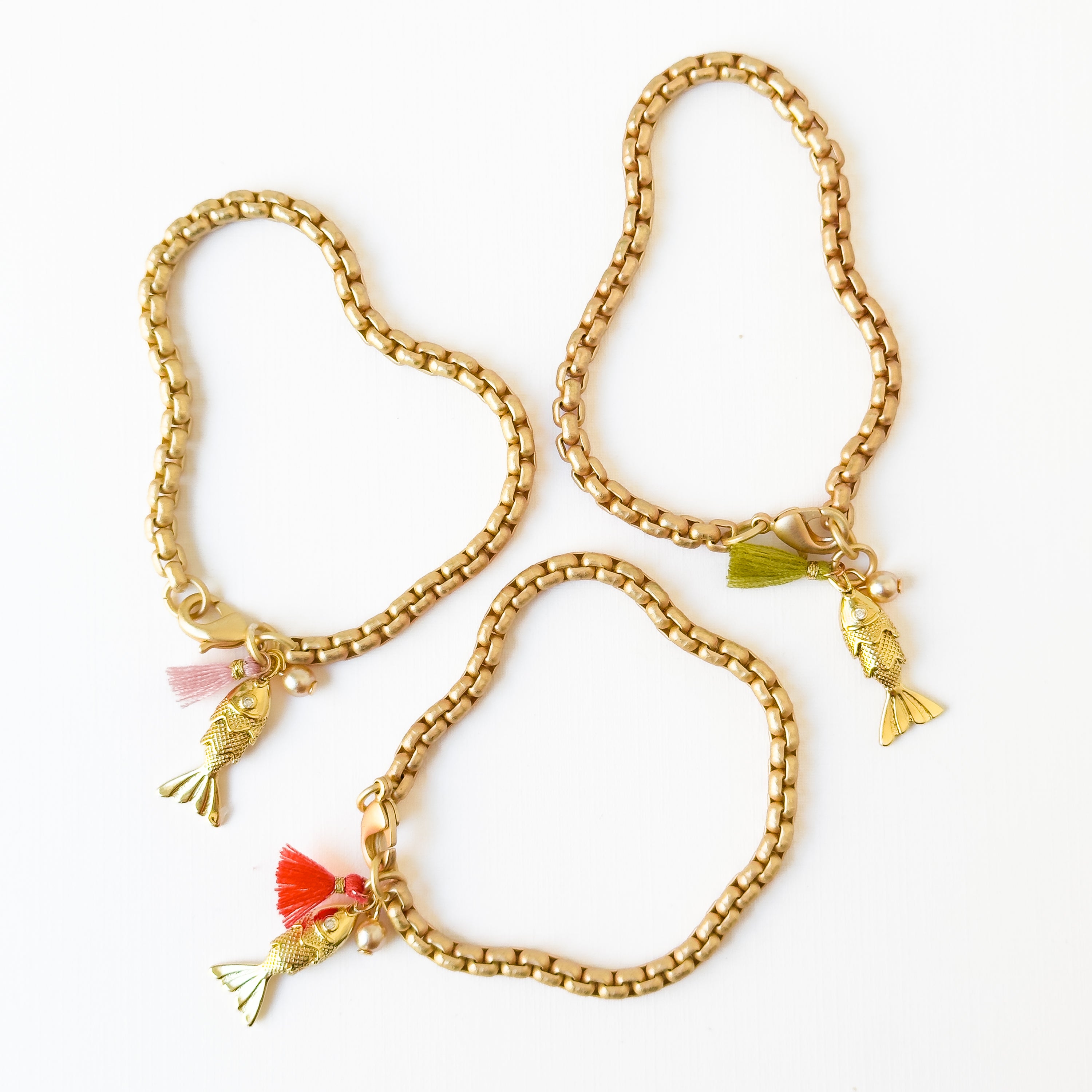 Bring a touch of whimsy and elegance to your holiday jewelry collection with this handmade 24K gold plated fish charm bracelet.The bracelet features a box satin gold chain, a small...