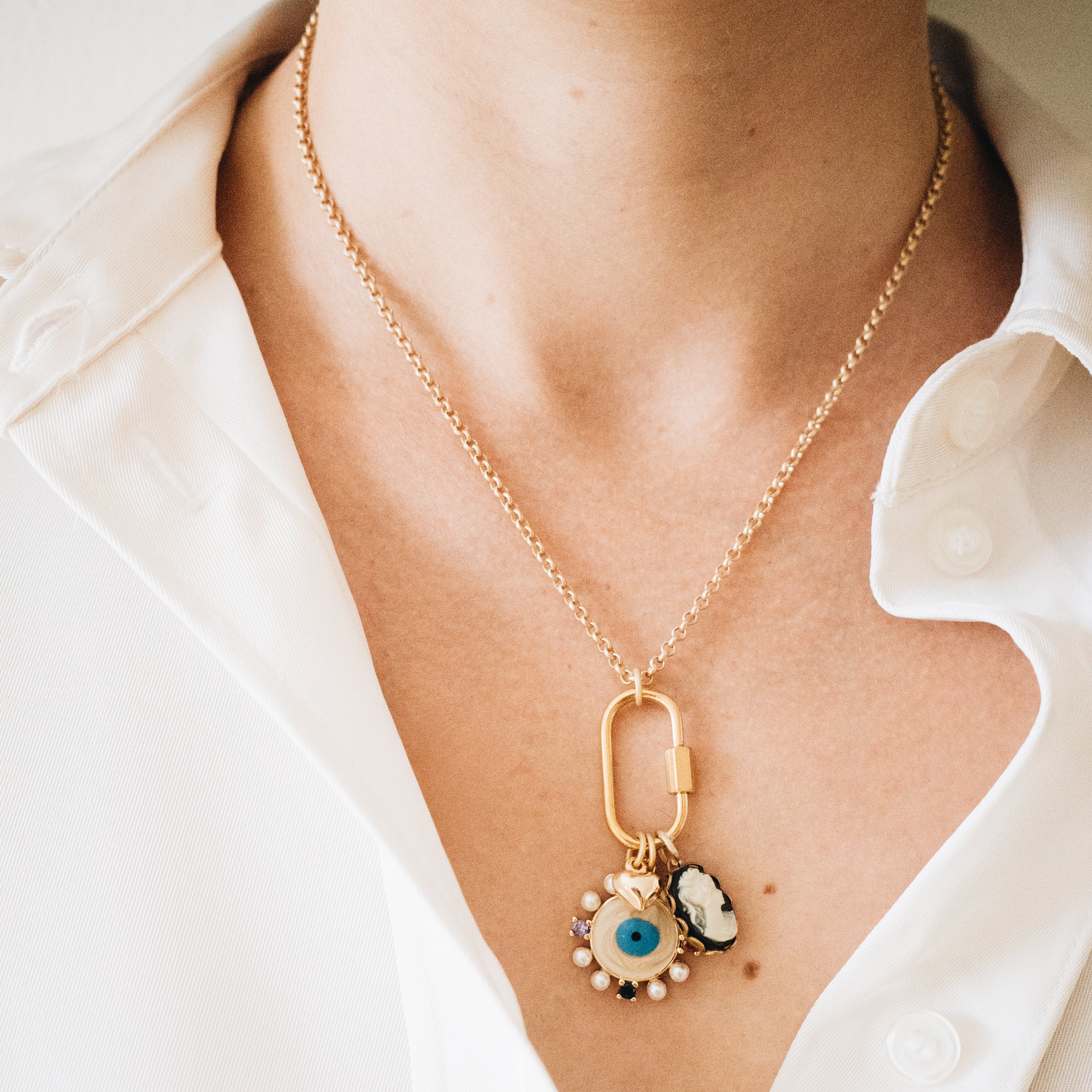 This handmade gold charm necklace combines vintage elegance and spiritual protection.Featuring an 18K gold filled evil eye pendant surrounded by pearls and colorful gems, a classic cameo, and a tiny...