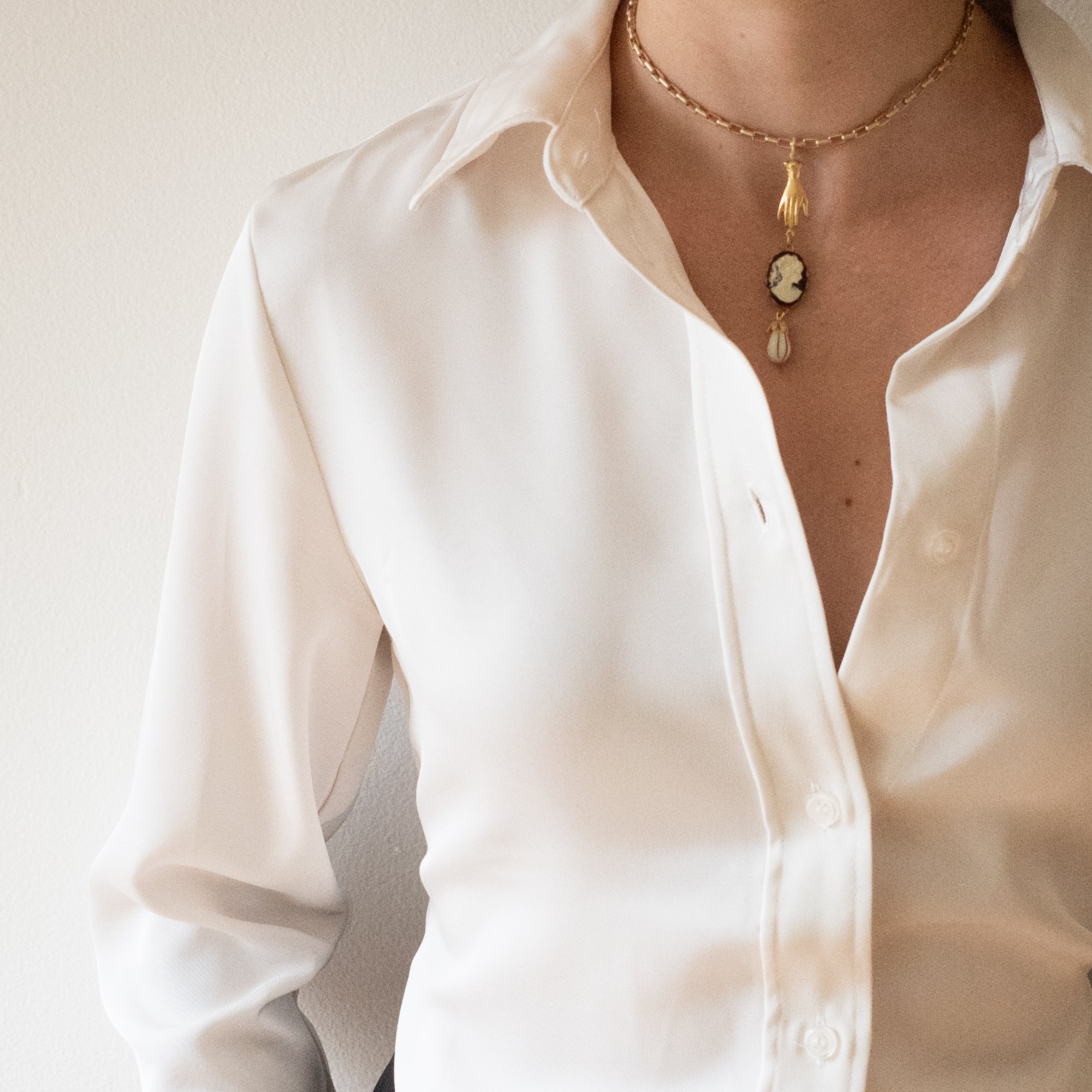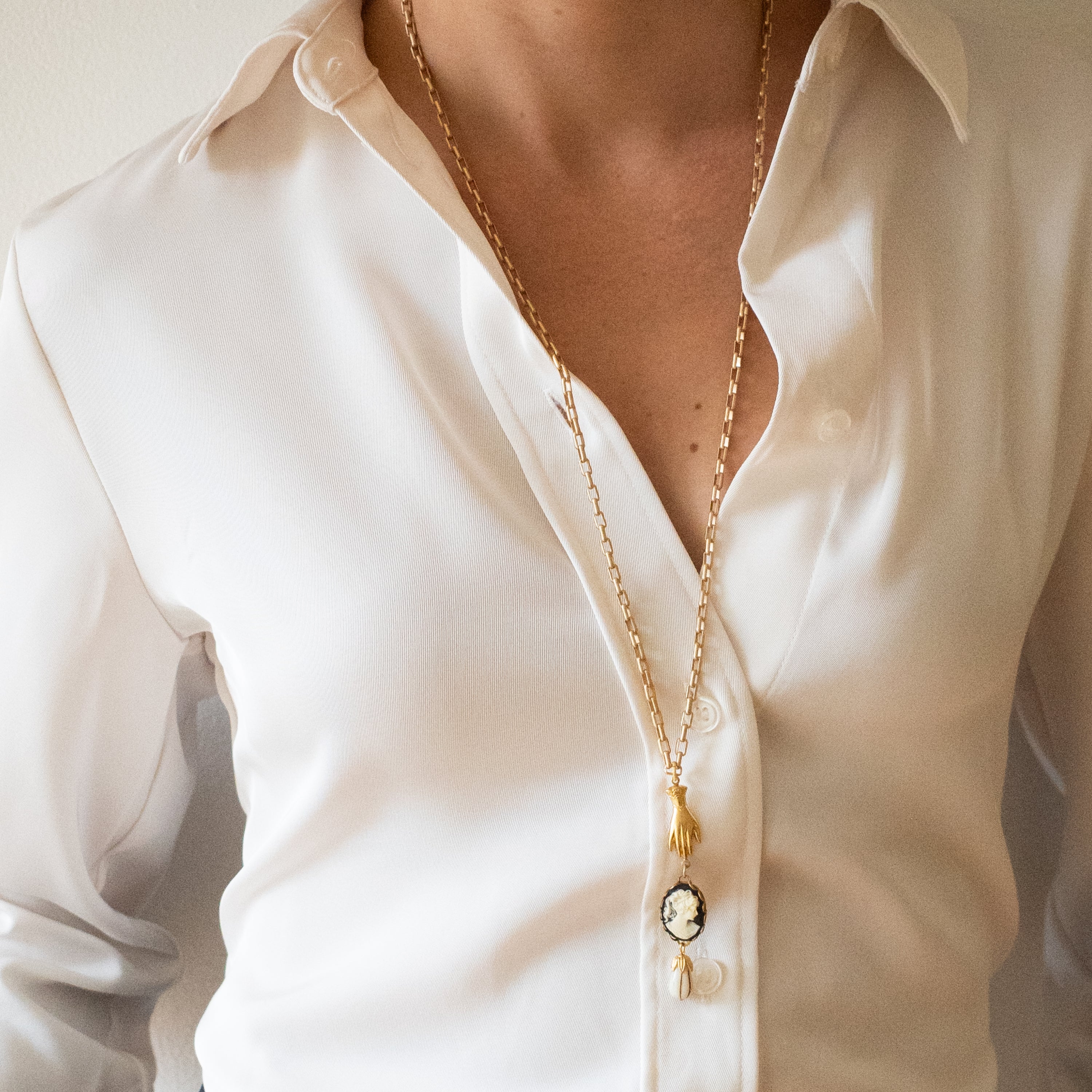 This vintage-inspired cameo necklace features a sculpted gold hand charm and a cream glass drop, suspended from a 24K satin gold plated paperclip chain.Elegant and symbolic, it’s a piece that...