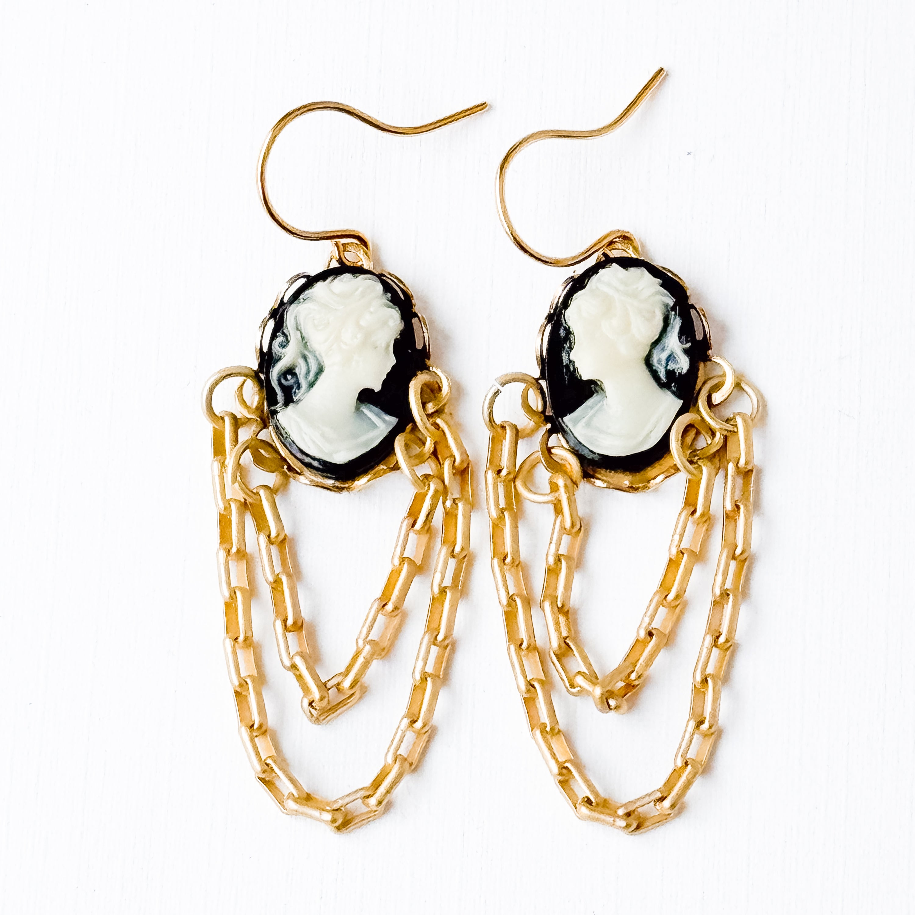 Elegant vintage-inspired cameo earrings featuring 14×10mm black-and-ivory cameos and double 24K gold-plated chains. These 1.5" long earrings blend classic charm with modern design and move beautifully with every step. Lightweight,...