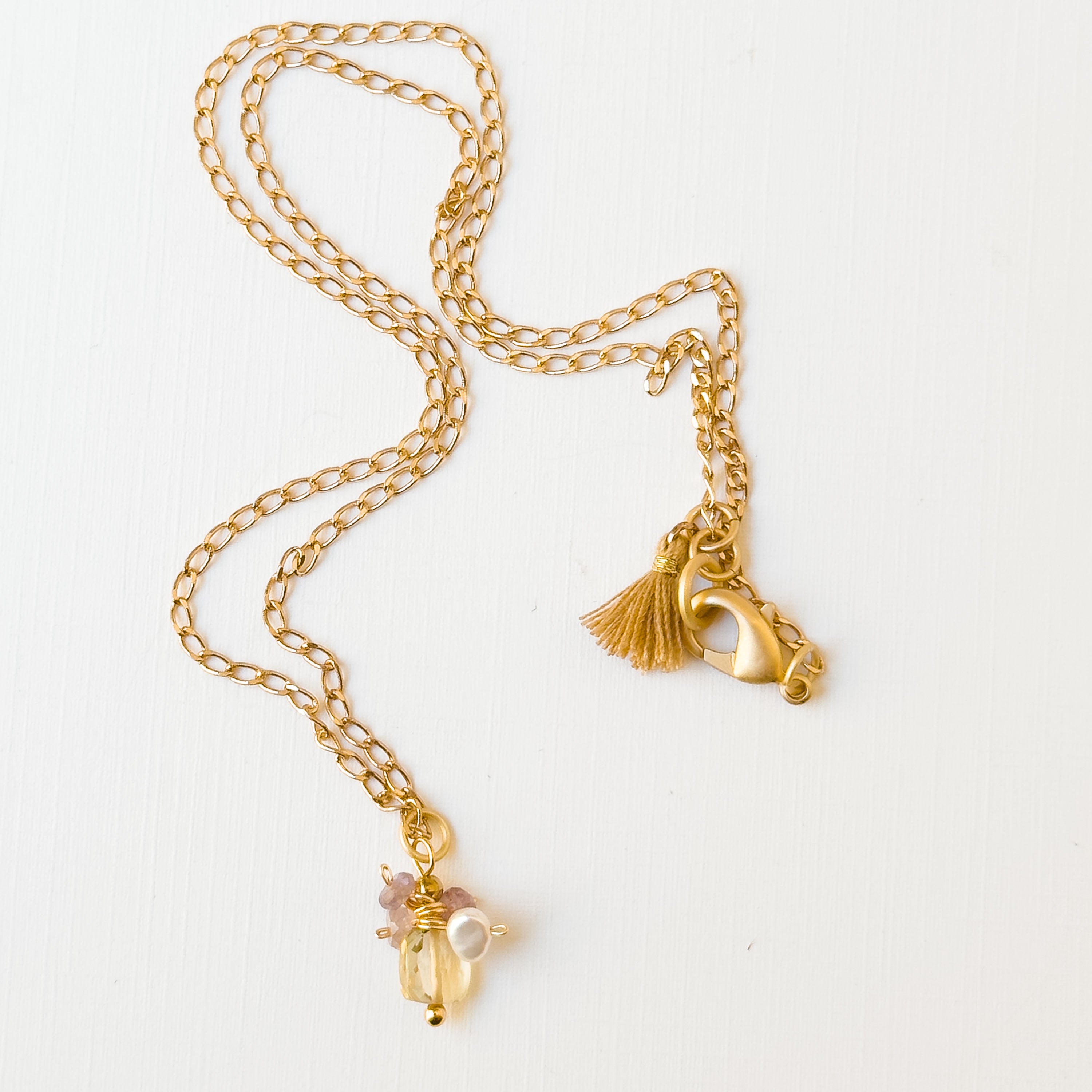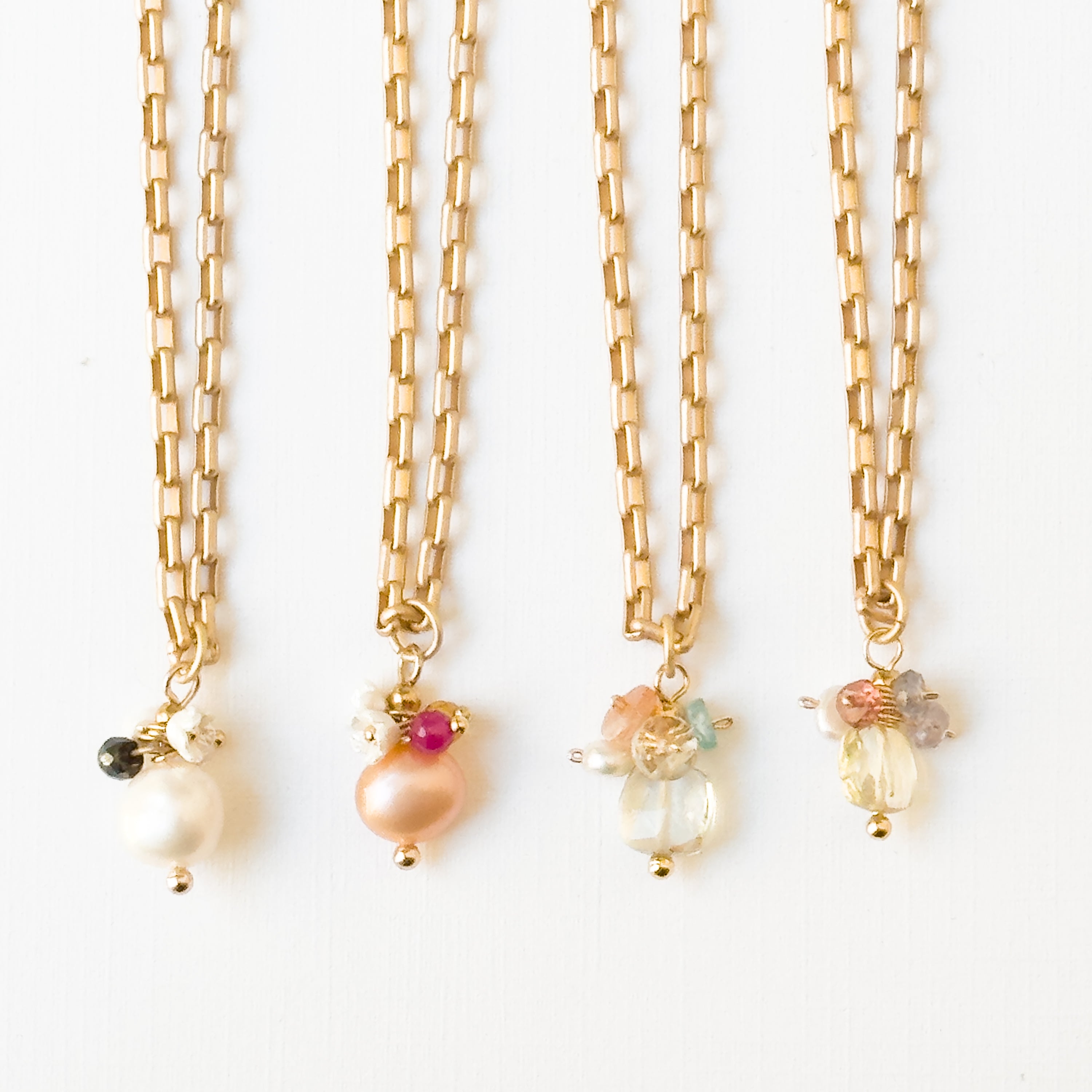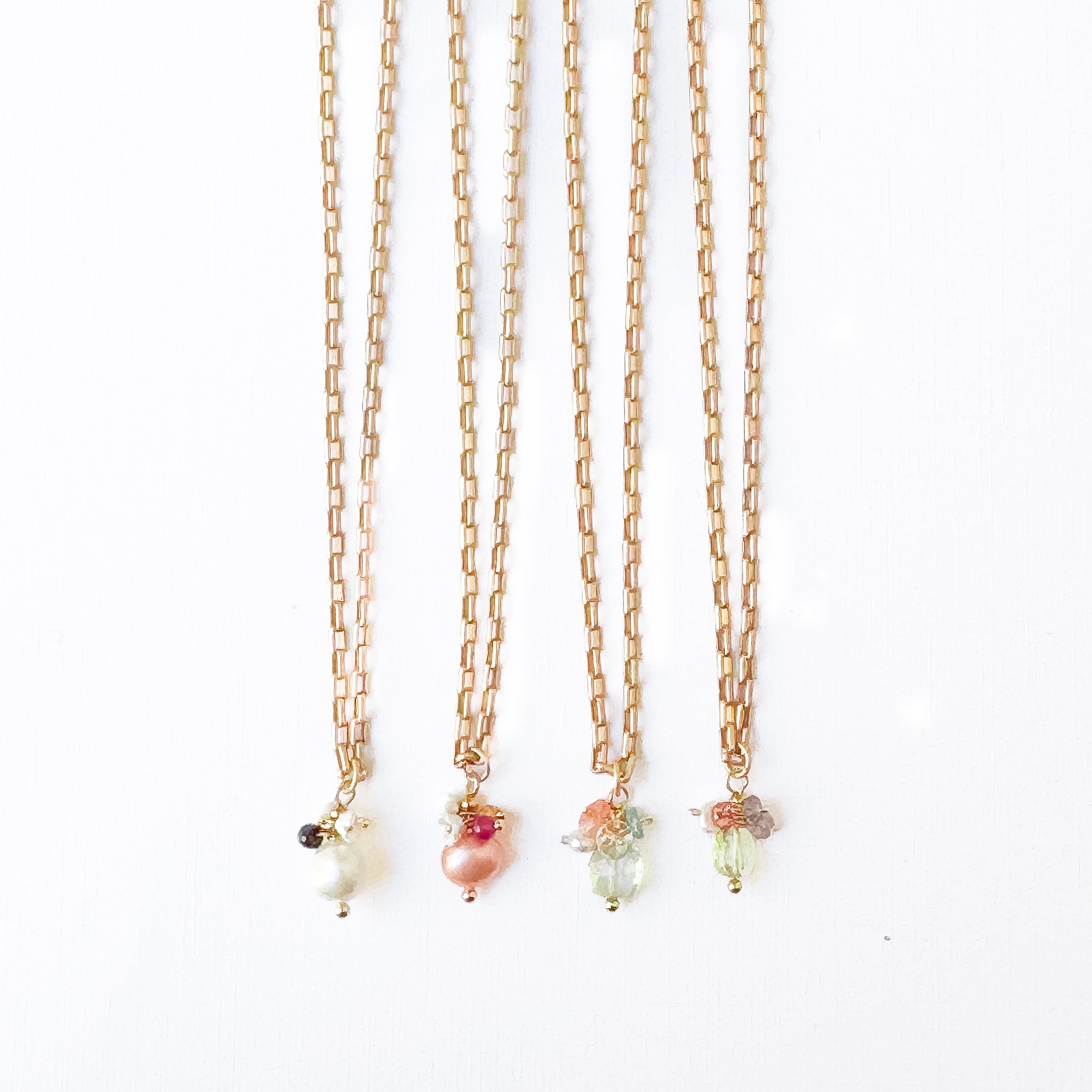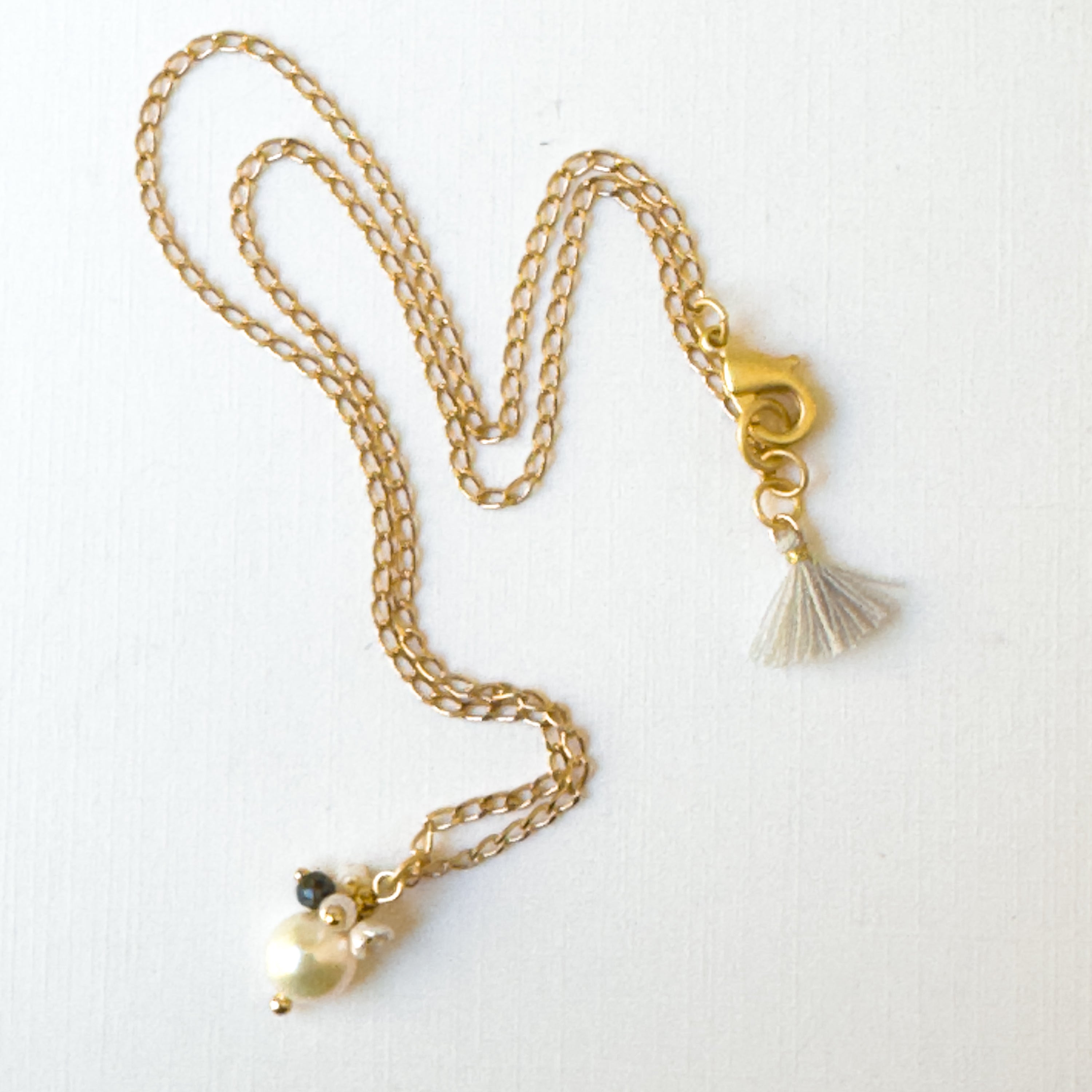 A beautiful, small link paperclip necklace made with four different bead options.The chain is 24K SATIN MATTE gold-plated (not shiny gold).Choose a white pearl with a tiny black accent bead...