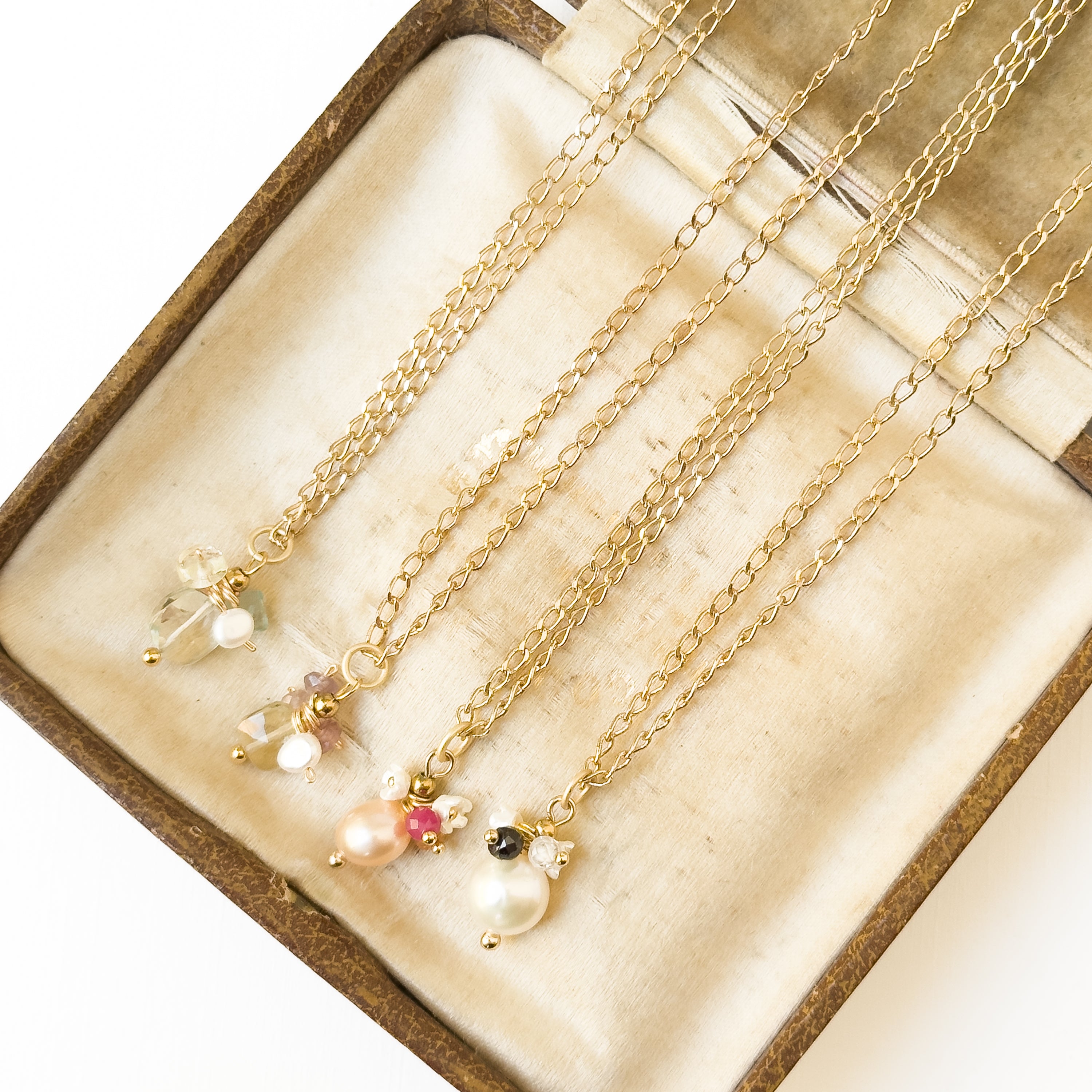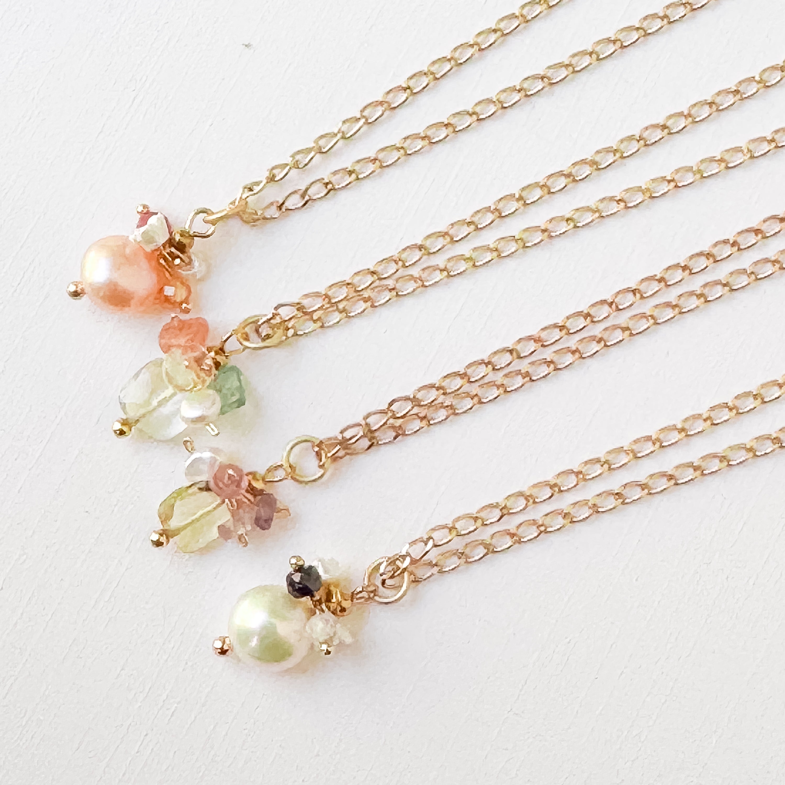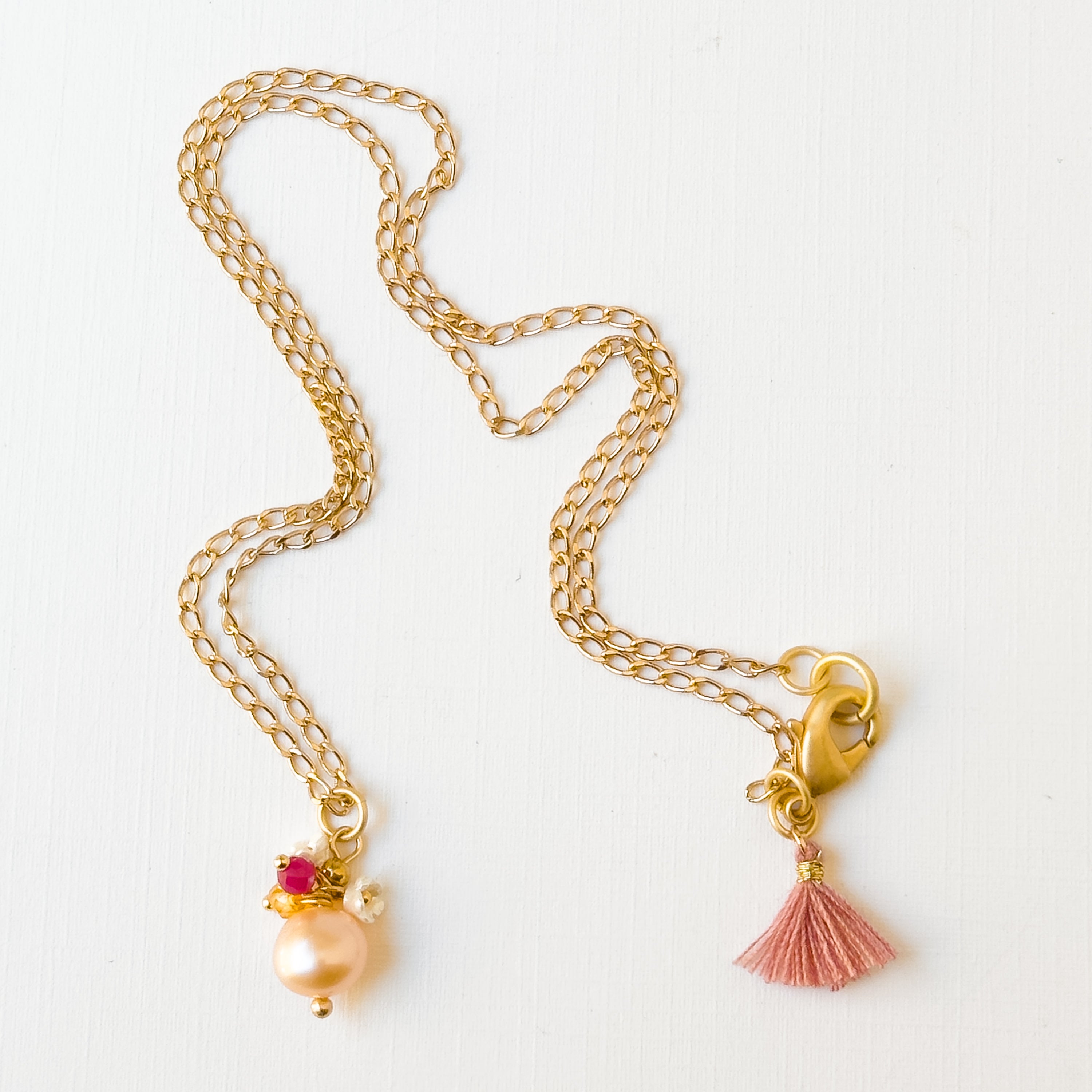 A delightful, dainty 24K gold-plated chain necklace with four different bead options.Choose a white pearl with a tiny black accent bead or a pink pearl with a tiny red accent...