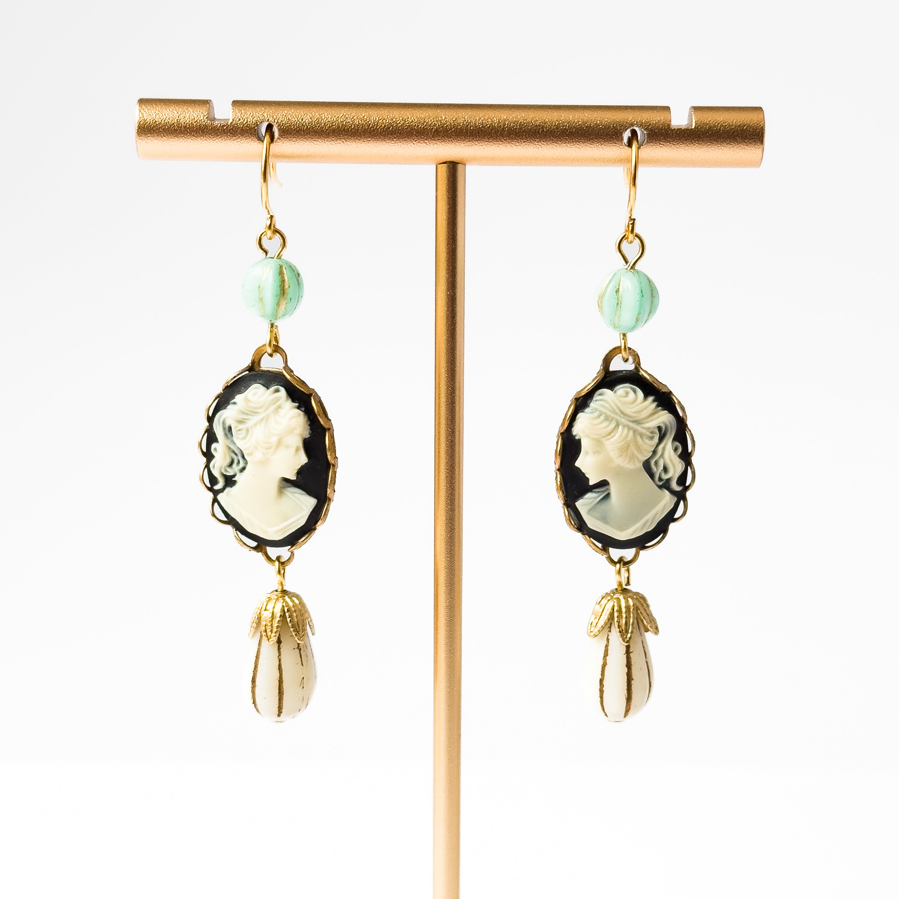 Elegant and romantic, these handmade cameo earrings feature vintage-style black-and-ivory cameos paired with soft light blue glass beads and off-white with gold-accented drops. Each earring measures approximately 2" long, offering...
