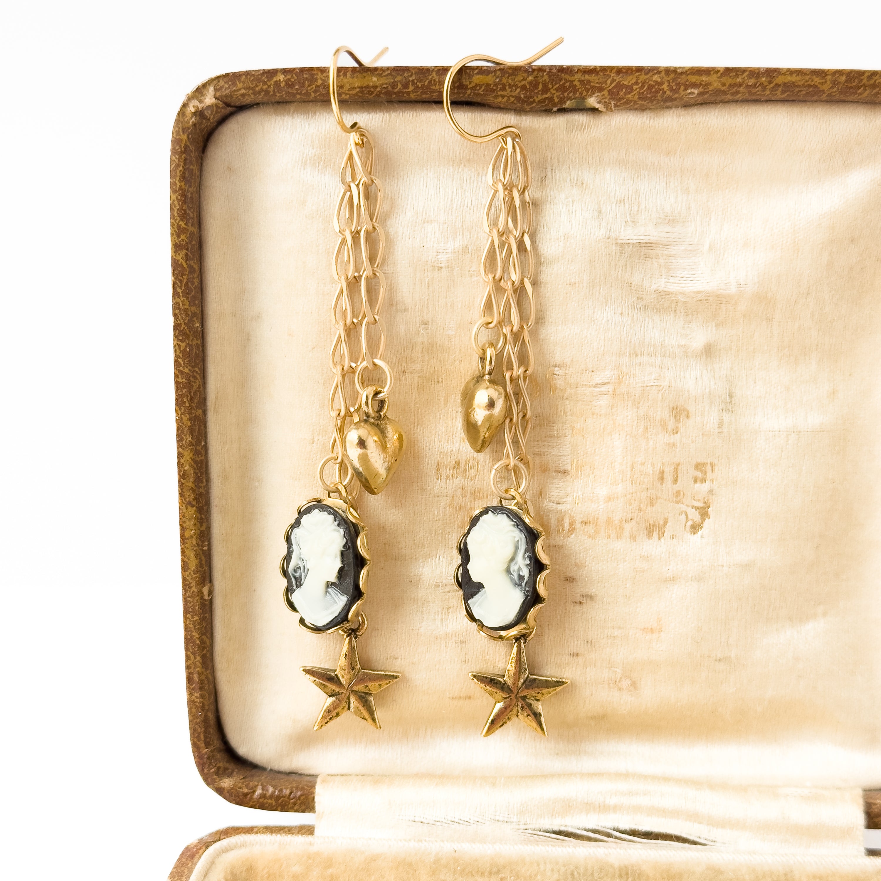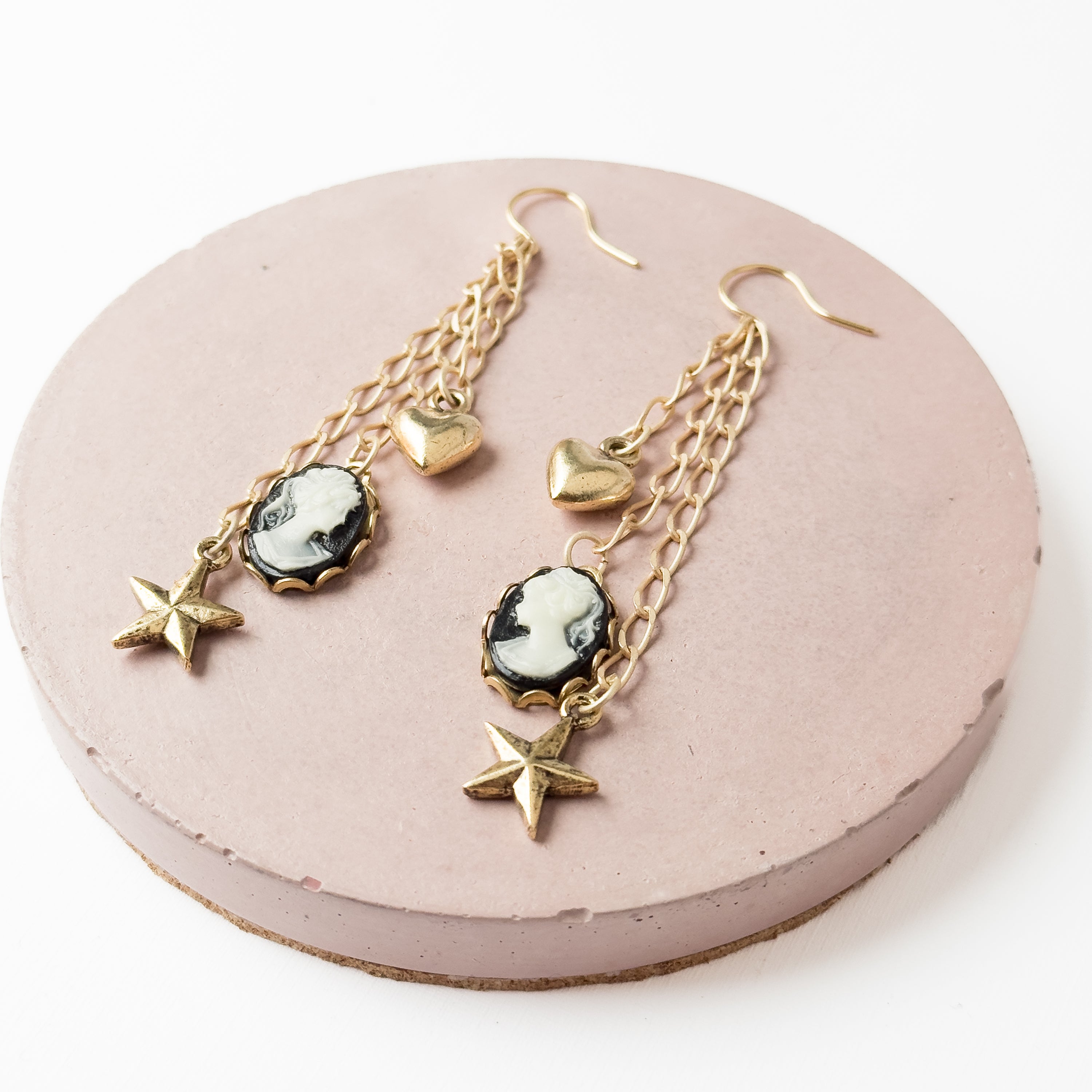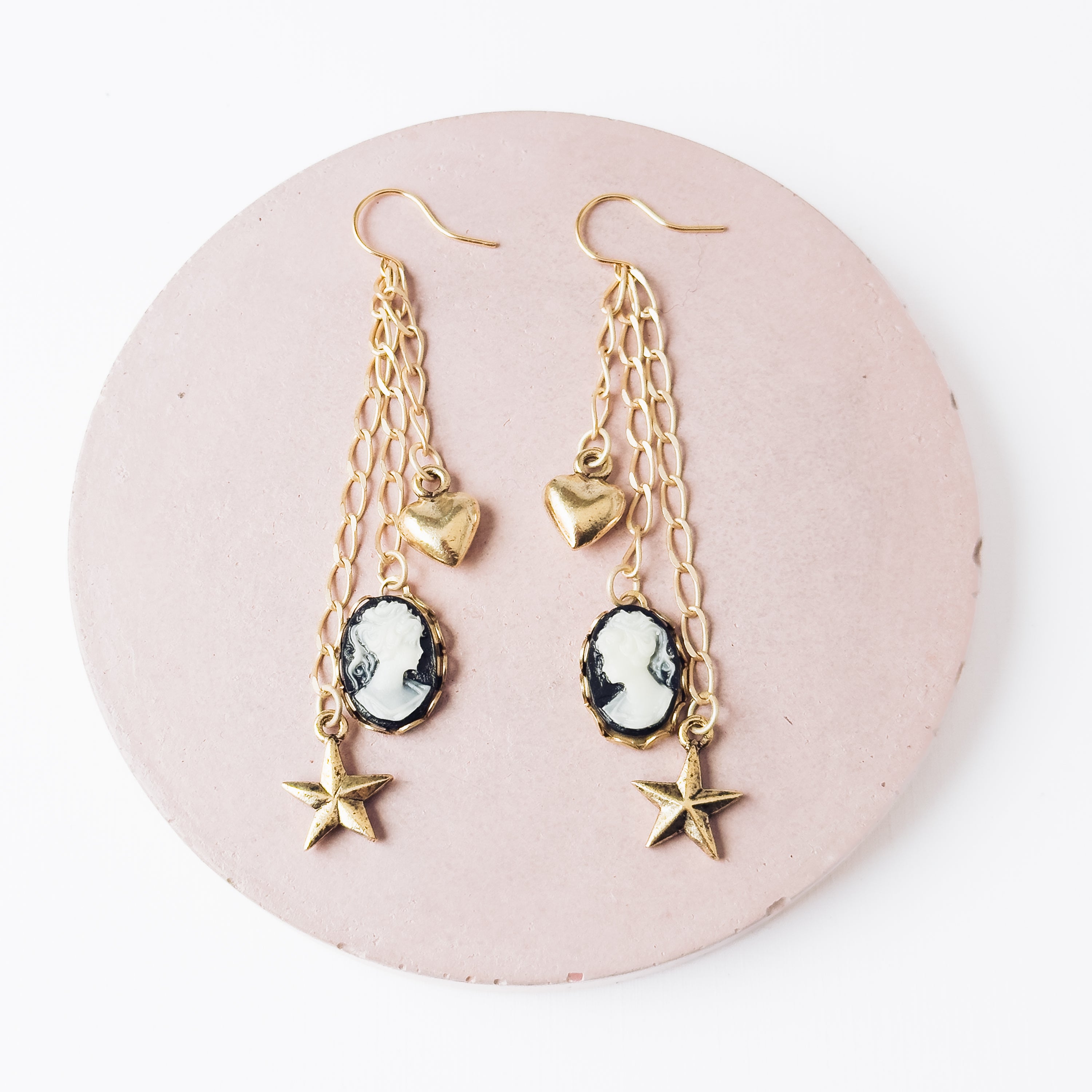 These vintage-inspired cameo earrings mix romantic charm with playful sparkle. Each earring features a classic black-and-ivory cameo, paired with a puffed gold heart, a shining star, and double 24K gold-plated...