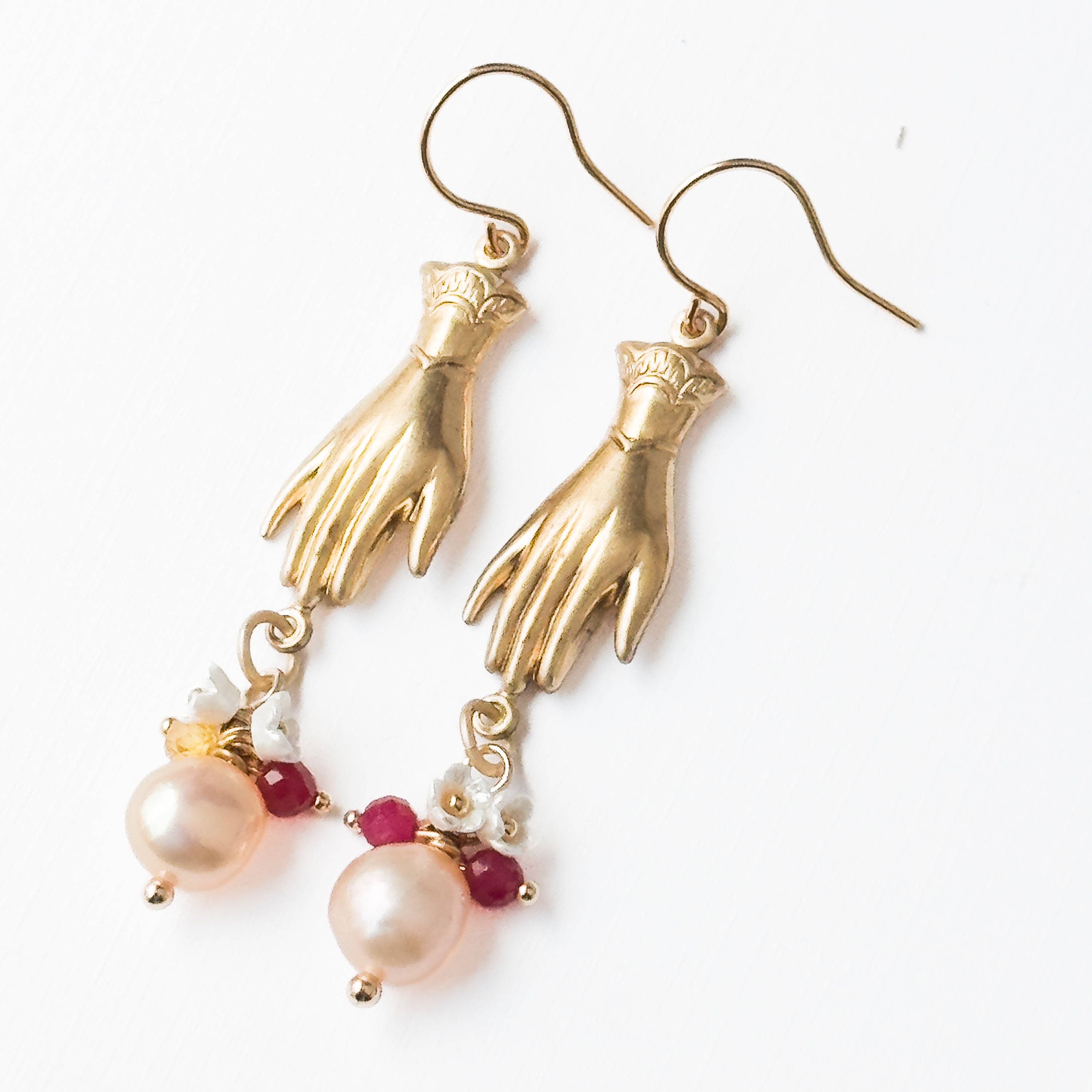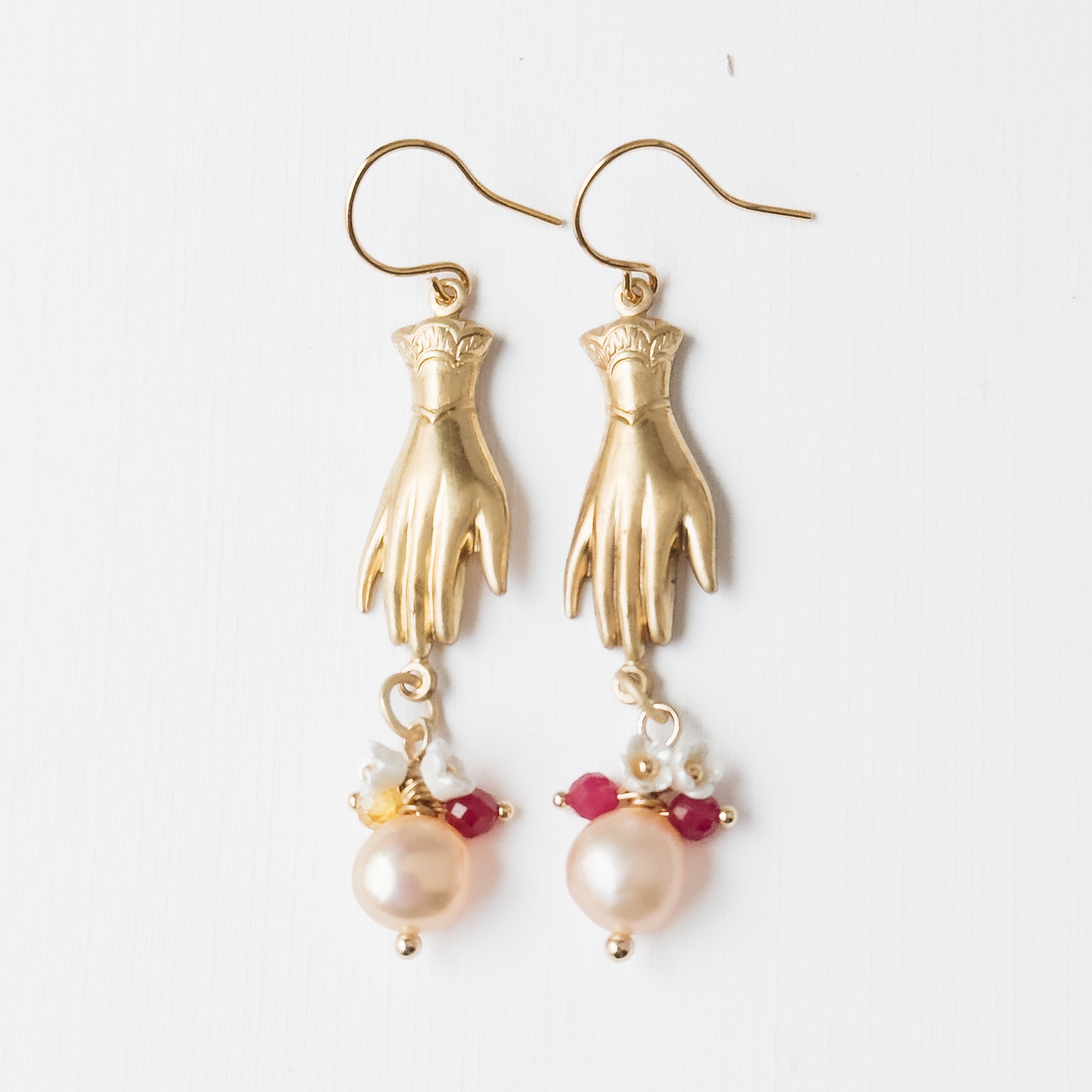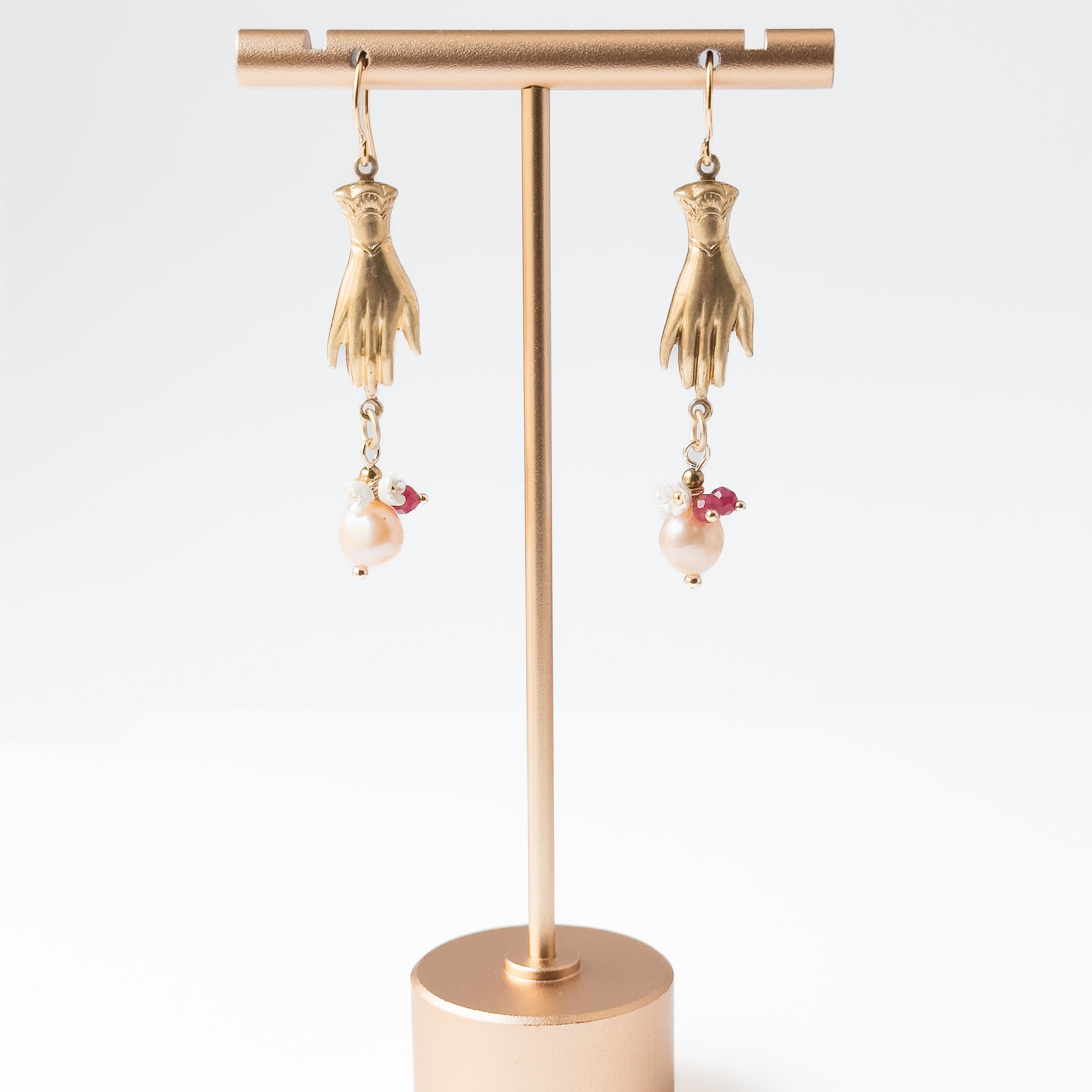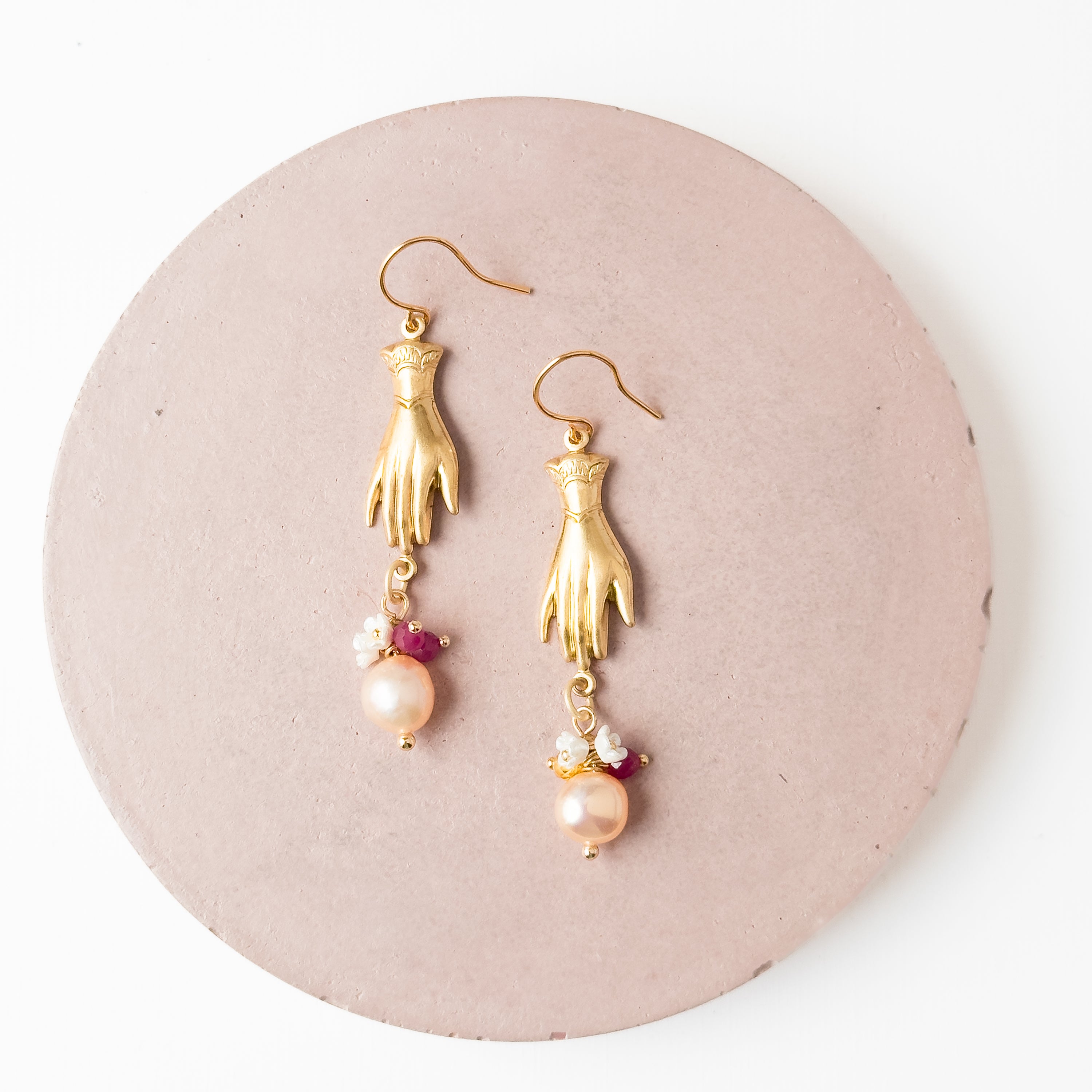 These romantic gold hand earrings symbolize grace and connection, adorned with freshwater pearls and tiny faceted gemstones in ruby and rose hues. Vintage-inspired yet modern, they bring a soft, elegant...