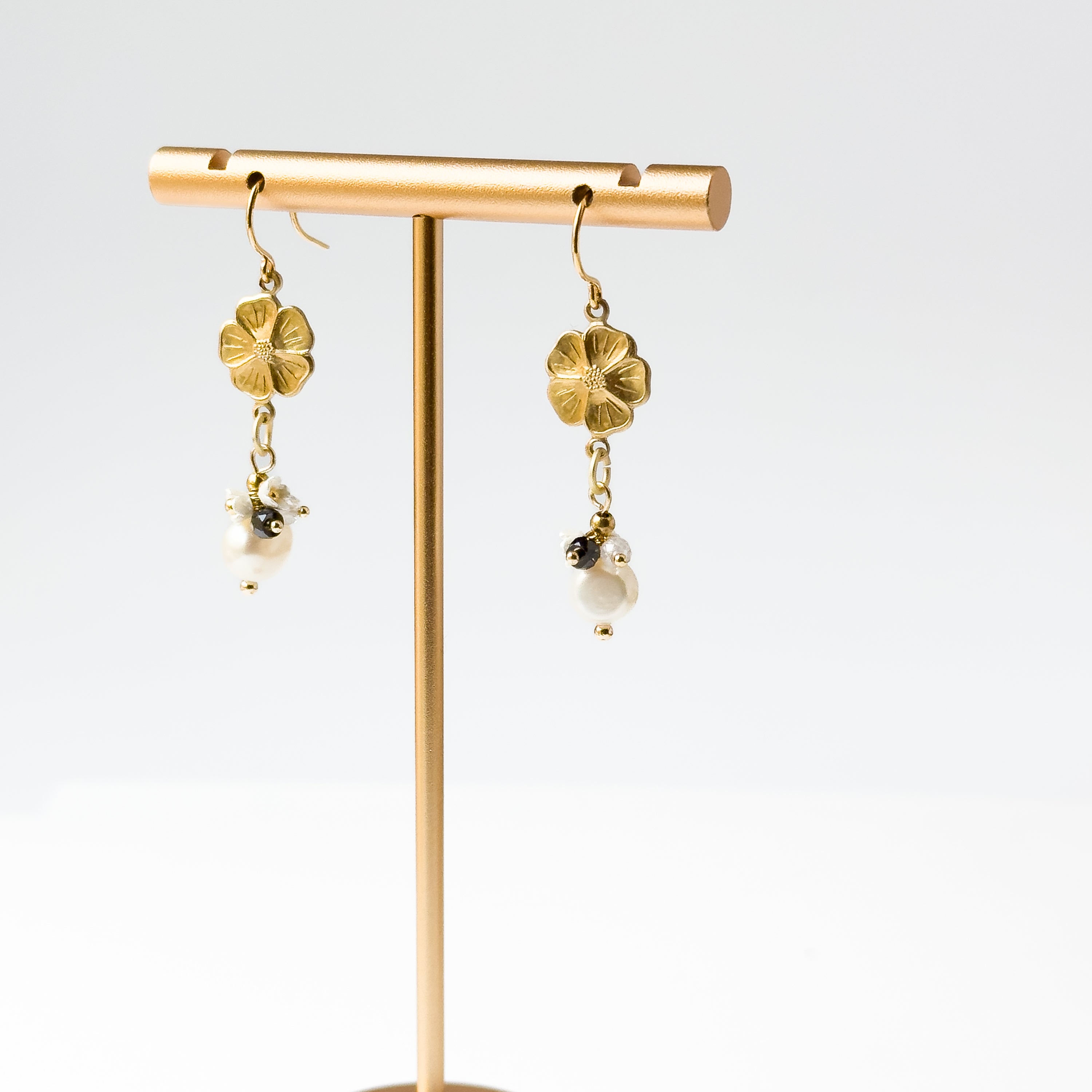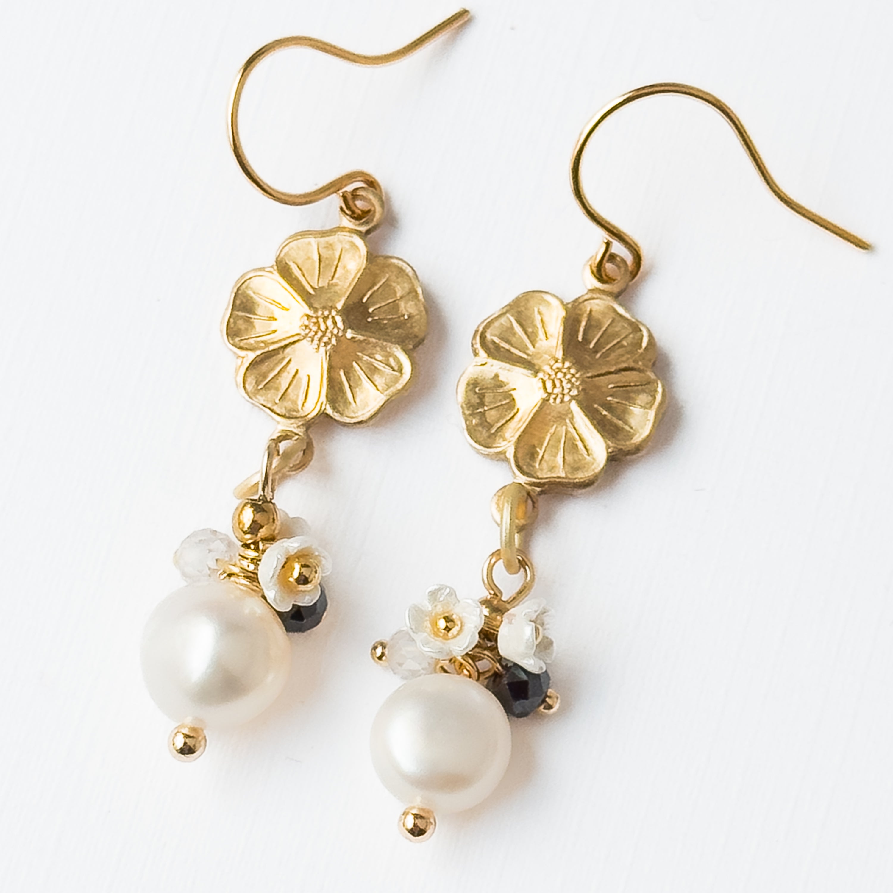 These romantic 1" long gold flower earrings feature intricate floral charms paired with luminous pearls and tiny gemstone details. Vintage-inspired yet modern, they’re elegant, lightweight, and perfect for everyday wear...
